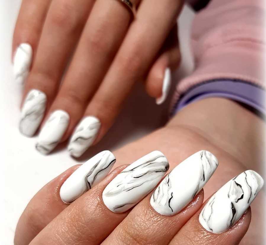 Мраморные ногти имитируют натуральный камень — настолько похожим получается дизайн. Такой вариант оформления одновременно женственный и деловой. Он будет уместен даже в сочетании со строгим дресс-кодом.