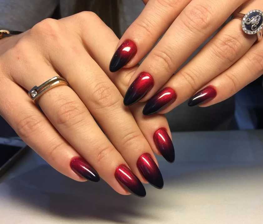 Мода от кутюр и бьюти-индустрия синхронизируются между собой. Градиентные переходы цветов — один из хитов последних сезонов. Ярко смотрится такой нейл-арт в сочетании с глиттерами, шимерами. Градиентные переходы от красного к черному и наоборот располагают не только по вертикали ногтевой пластины, но и по горизонтали, диагонали.