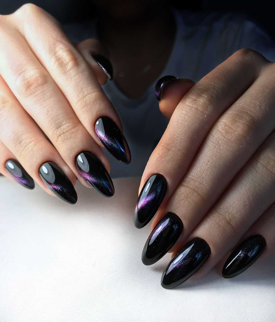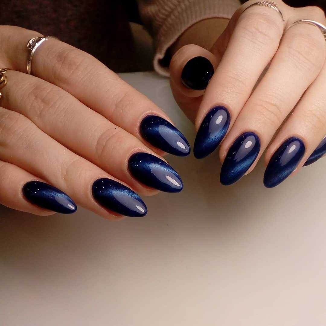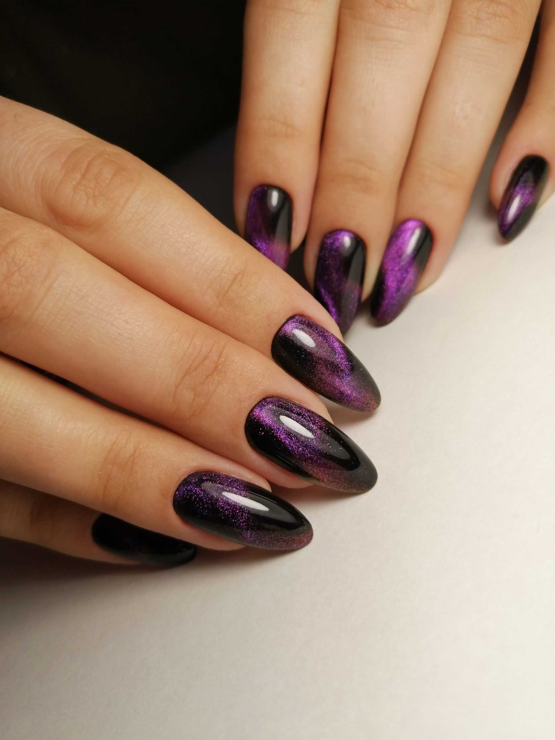 Кошачий глаз. Этот маникюр выполняют с помощью специального лака с металлическими частичками. После нанесения над покрытием проводят магнитом, что, в свою очередь, воздействует на металл. Частички поднимаются и образуют красивый узор.