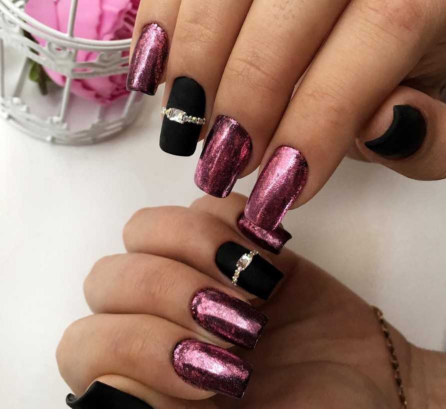 Если нанести жемчужную втирку на черный гель-лак – получится весьма загадочный и необычный образ. Его могут позволить себе решительные и властные женщины, молодые уверенные в себе девушки. Это идеальный маникюр для маленького черного платья.