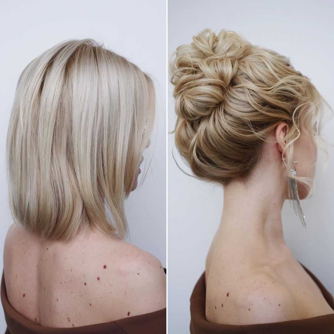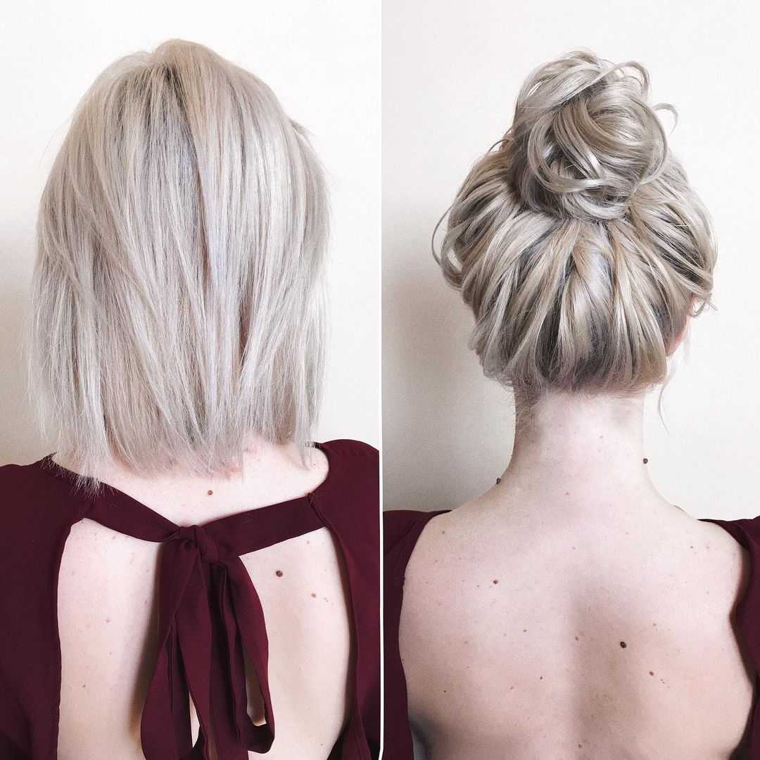 аккуратные или небрежные пучки тоже могут получиться из каре. Использовать валики (поролон) в виде формы не стоит – может не хватить волос, чтоб его прикрыть, лучше просто собрать волосы и заколоть шпильками. Можно использовать красивую заколку для закрепления и для изюминки в образе;