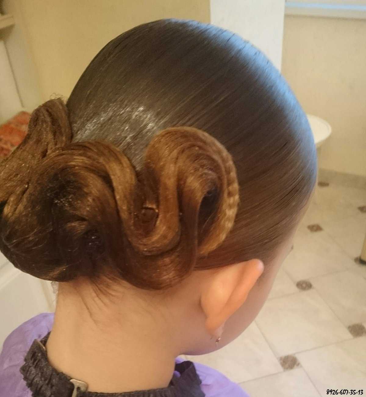 Этот вариант подходит и для европейской программы, а также хороши такие прически для гимнасток и балерин. Длинноволосые танцовщицы просто закручивают плотно волосы в гульку, заворачивая в сеточку под цвет своих волос, а обладательницам локонов средней длины для объема конструкции нужно воспользоваться поролоновым валиком.