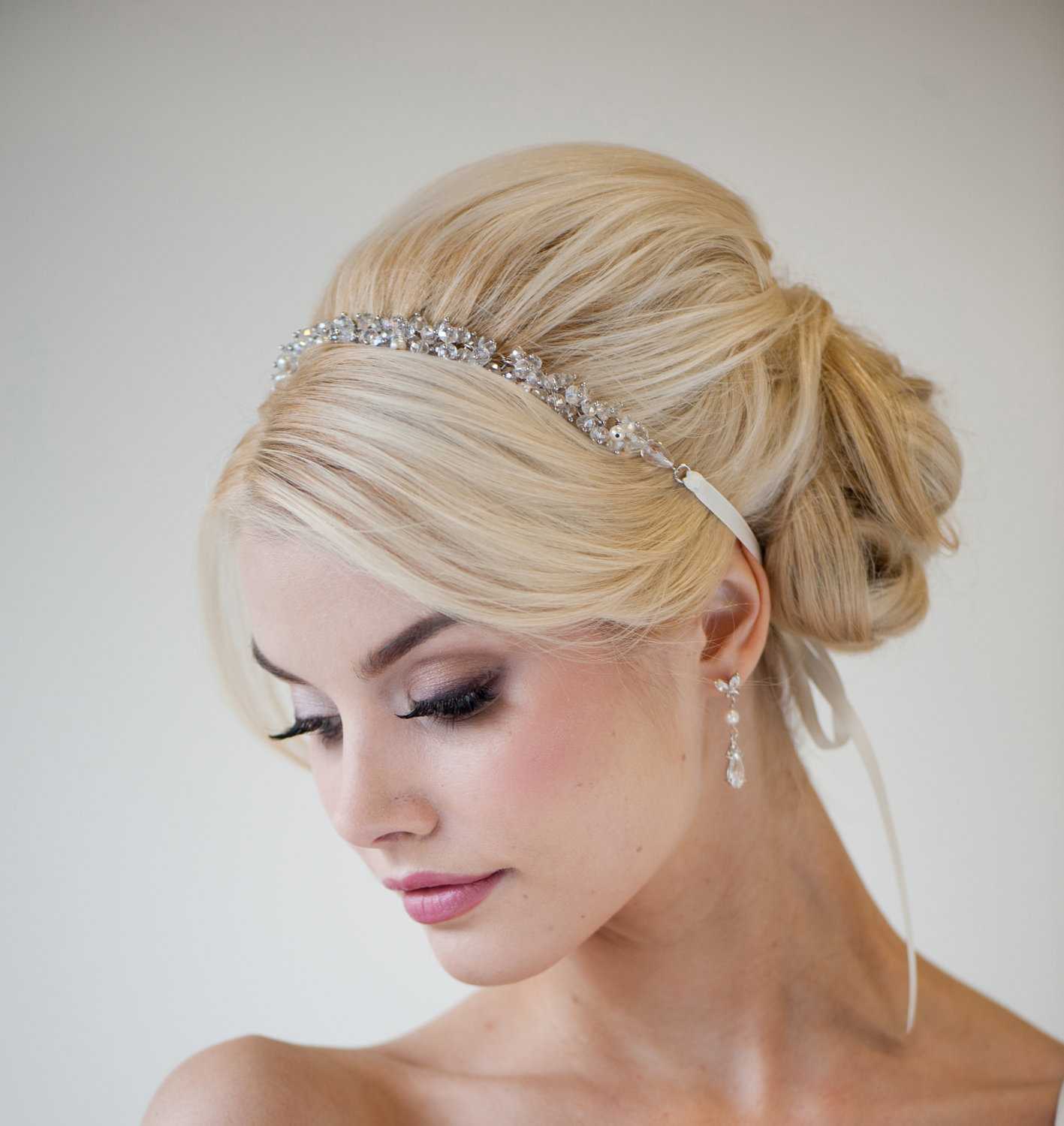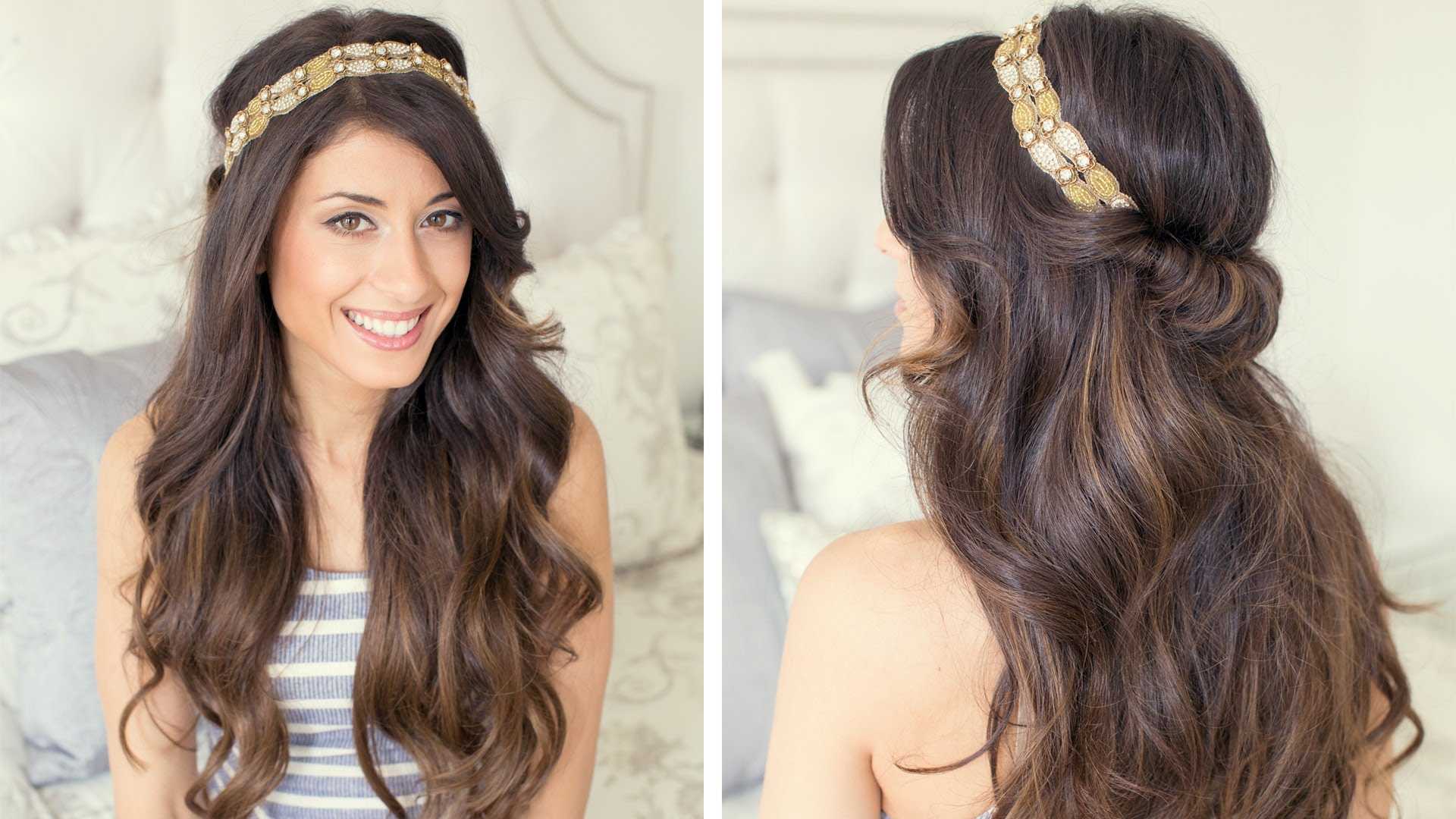 Прическа универсальная, подходит для торжественного события и на каждый день. Золотая, красивая повязка, ободок со стразами — неизменный атрибут для создания образа истинной богини. Использовать его можно несколькими способами:
