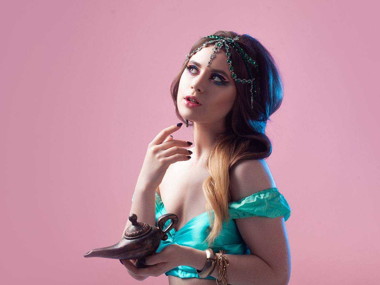 И не забываем про золотую диадему и крупные серьги — без них образ Жасмин будет неполным.
