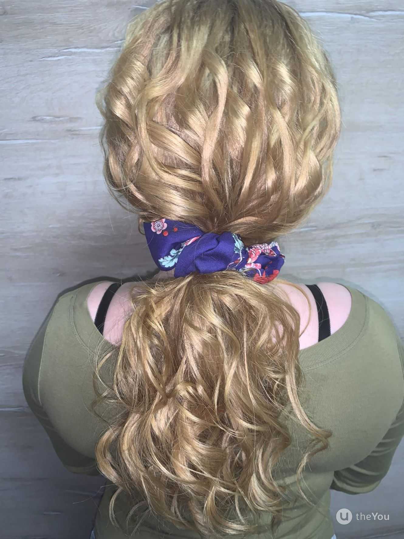 Также можете попробовать завить волосики, а оригинальность прическе придаст красивая резинка, которая может быть украшена, например, большим цветком или бантом.