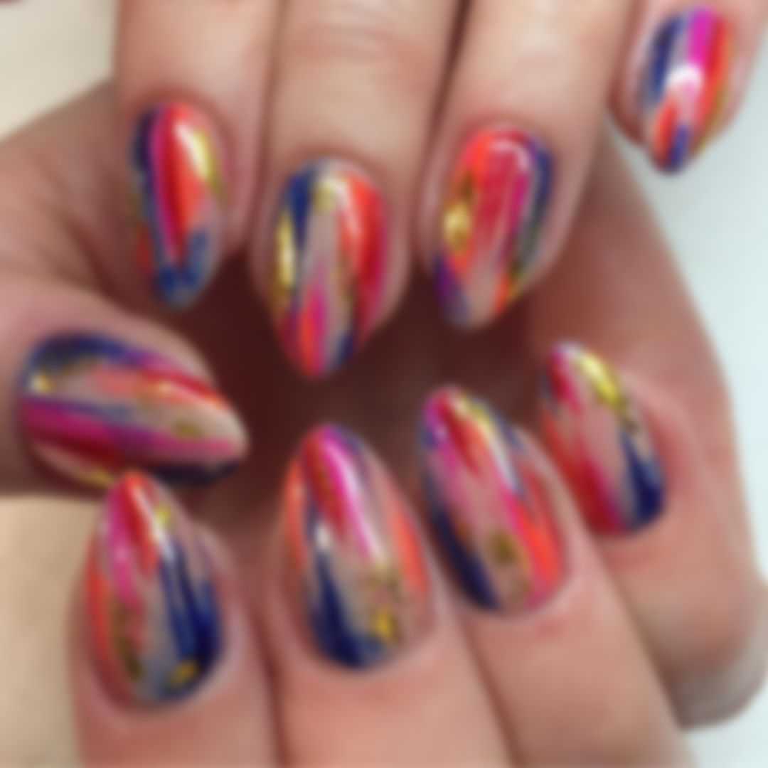 Если вы ищете идеальный нейл-арт для следующего маникюра, то акварельный эффект – это то, что вам нужно. Дизайн имитирует смешение и высыхание краски на холсте; сочетание этого и ярких цветов делает его женственным и забавным вариантом. Чтобы создать такой дизайн простым способом, вы можете выбрать наклейки для ногтей, но если вы одна из тех женщин, которые предпочитают экспериментировать со своими любимыми лаками, выберите базовое покрытие и дайте ему высохнуть. Затем добавьте слой белого лака, и когда он высохнет, вы можете использовать кисть для нанесения выбранных оттенков. Нанесите несколько капель каждого цвета на кусок фольги и нанесите кистью. После каждого оттенка окунайте кисть в ацетон, а затем в желаемый лак и повторяйте процесс с другим цветом.