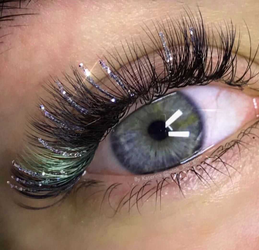 Если используют сухой пигмент, то сначала реснички покрывают блестками, а уже затем вклеивают в ресничный ряд, как можно увидеть на фотографиях ниже: