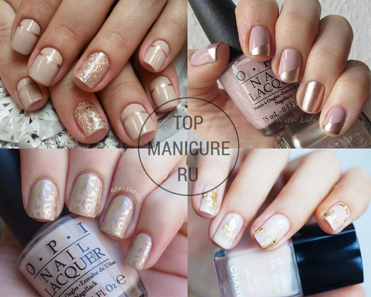 Бежевый маникюр с золотом идеально смотрится на коротких ногтях. Украшенные золотой лентой для дизайна или френчем ногти отлично подойдут для свадьбы или других торжественных случаев.