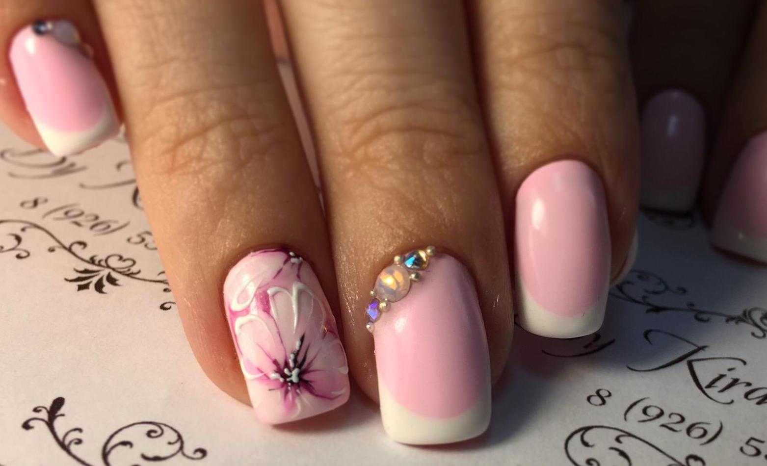 Нежный, женственный вариант оформления ногтей. Для френча используют шеллак или гель-лак розовых оттенков. Край ногтевой пластины может иметь разную форму: абстракция, геометрия, сердце. В качестве декора используют стразы, блёстки.