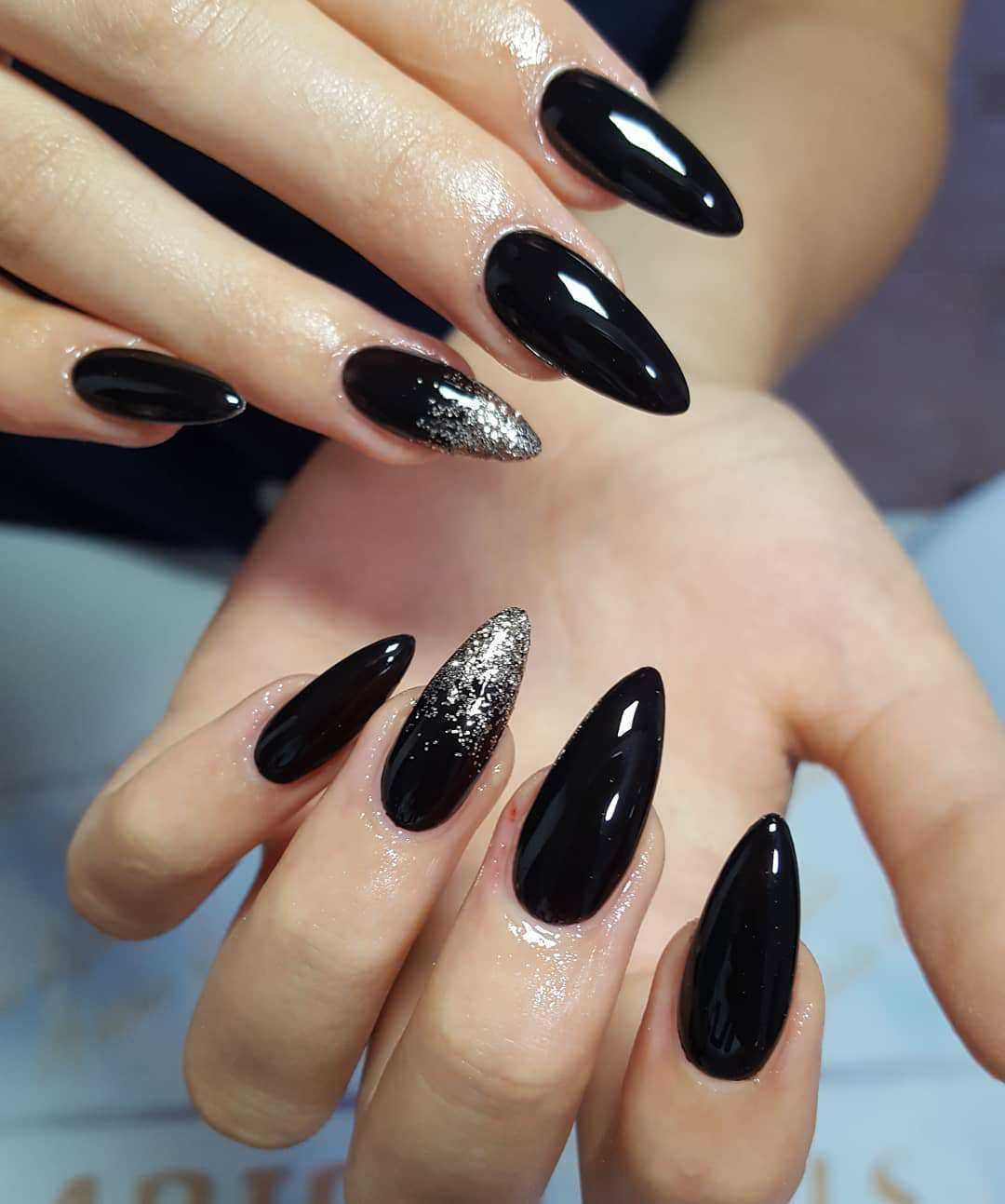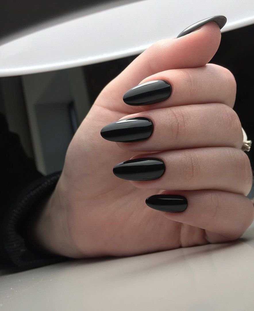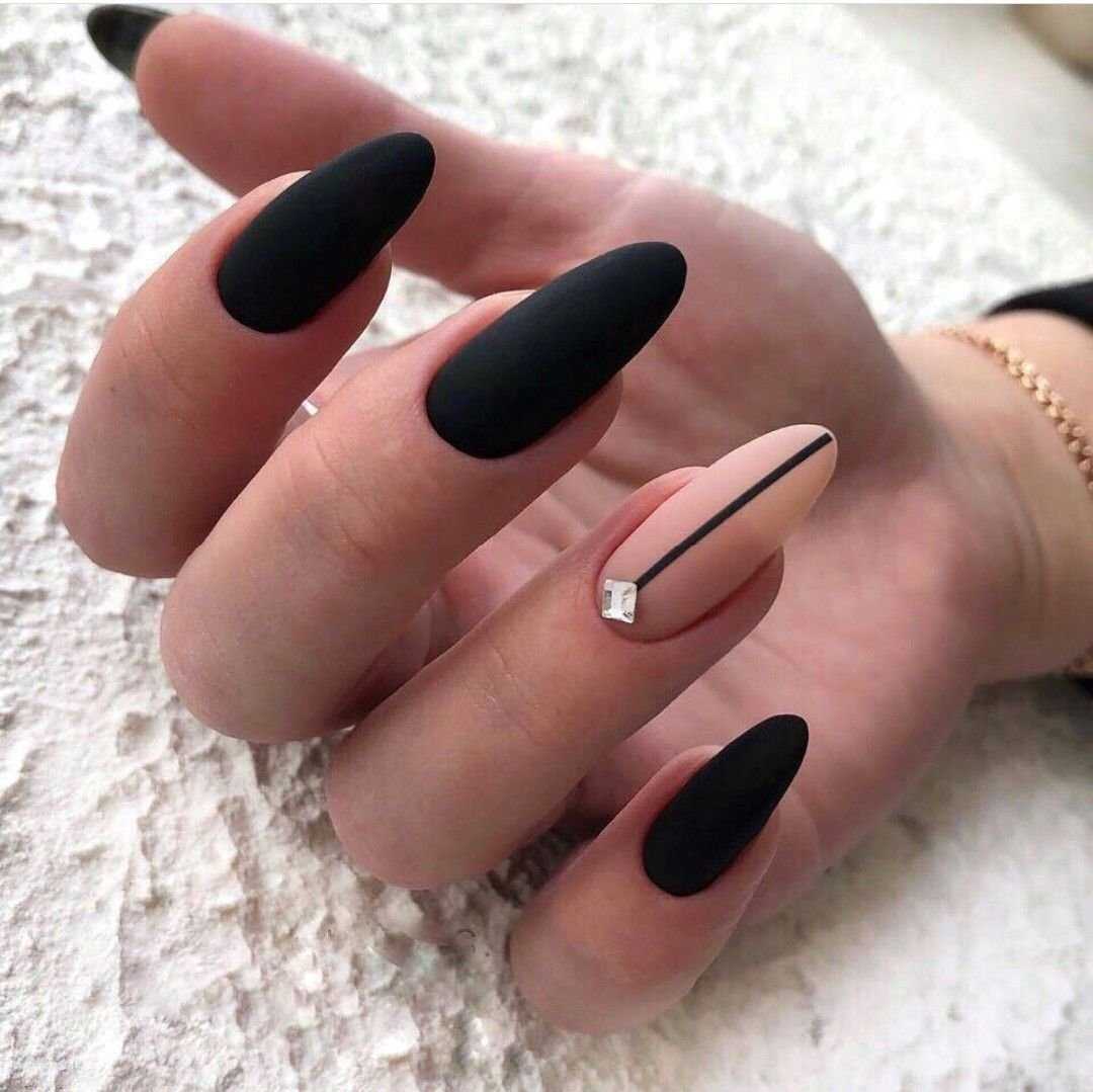 Изящность и утонченность черного миндального маникюра не сравнится ни с одной другой формой. Притягательными окажутся черные ногти миндаль с мраморным дизайном, матовым и сатиновым топом, полосками и флористикой.