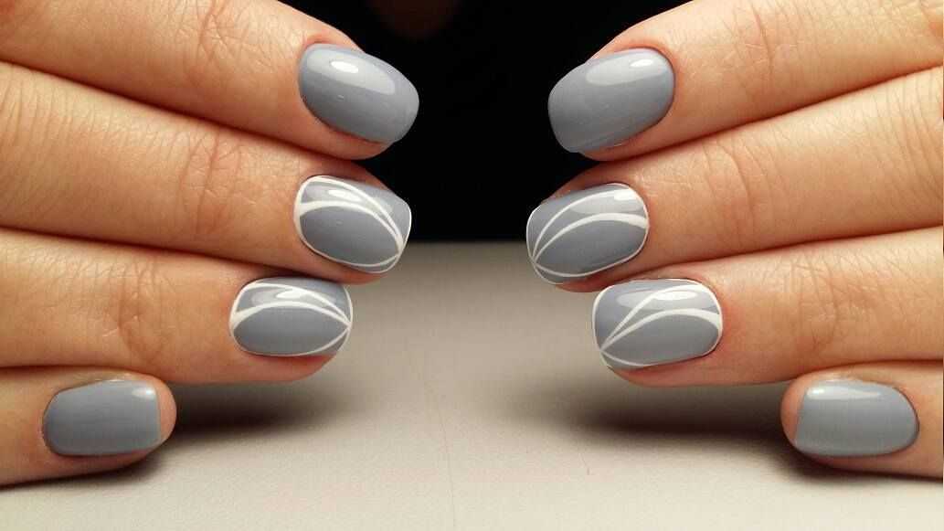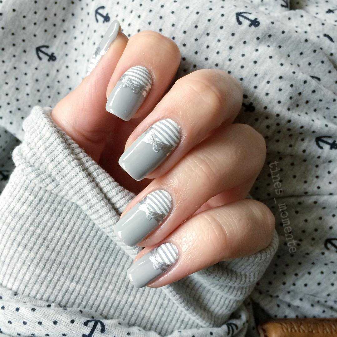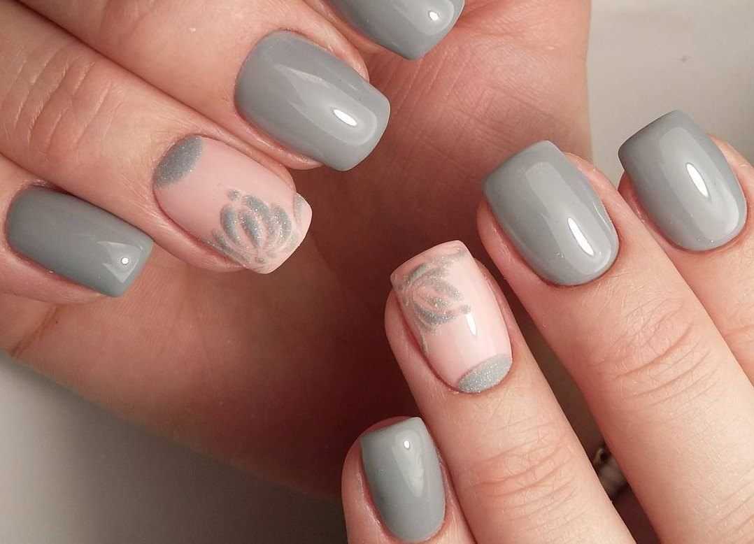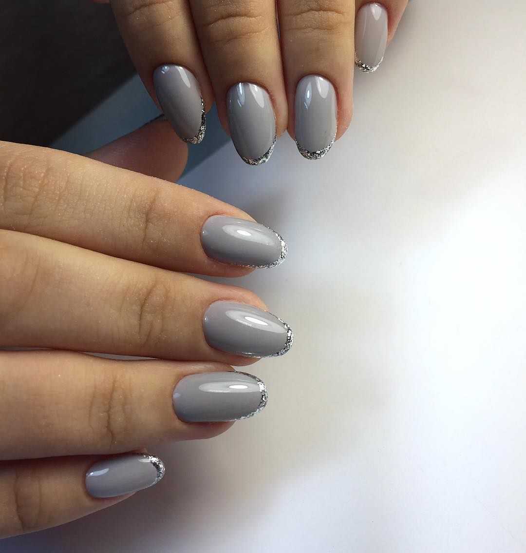 В рамках одного дизайна специалисты могут использовать сразу несколько оттенков серого, глянец, мат и серебристого цвета лак с перламутровым блеском либо глиттер. Как правило, оформляется подобный маникюр в виде полос.