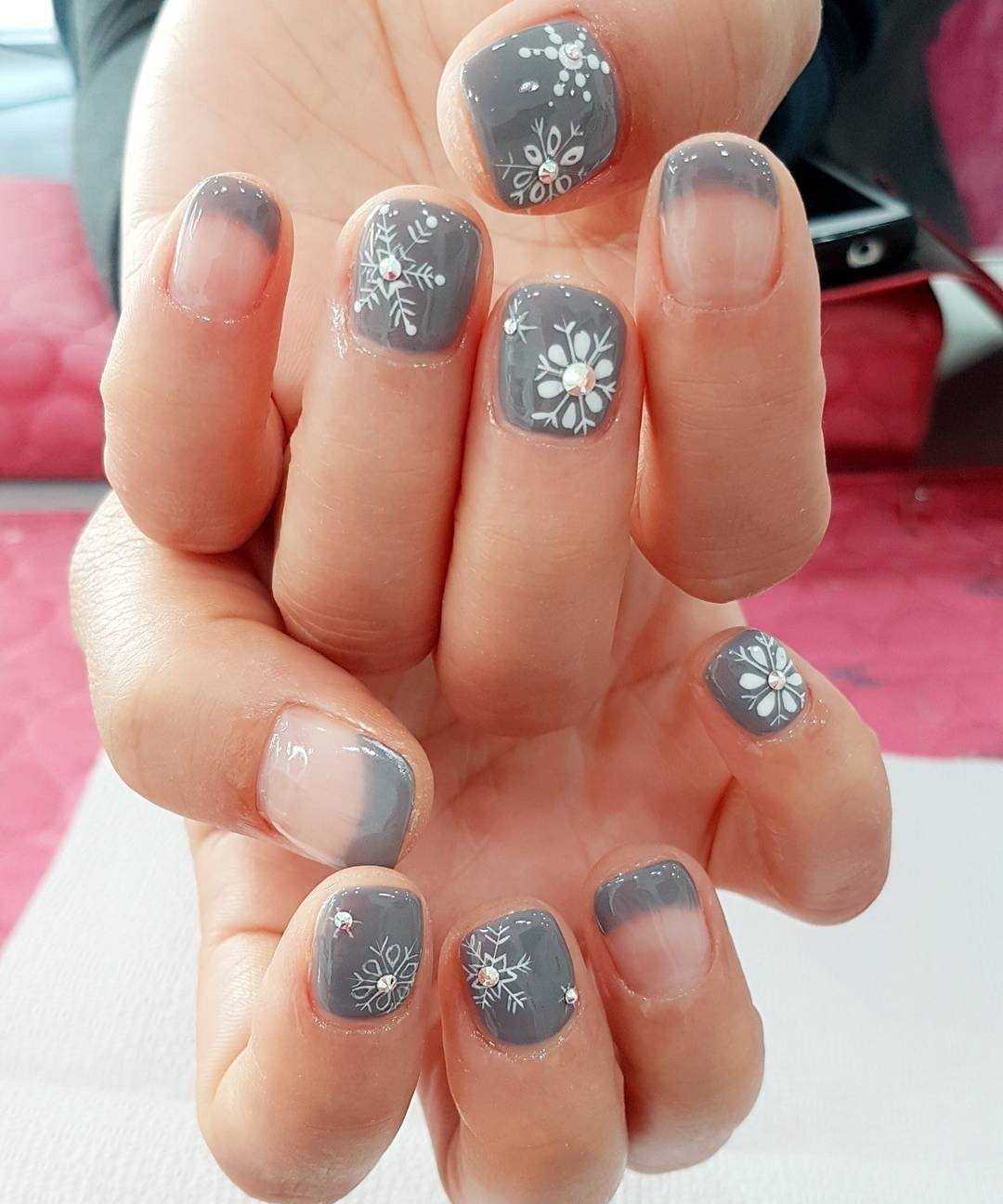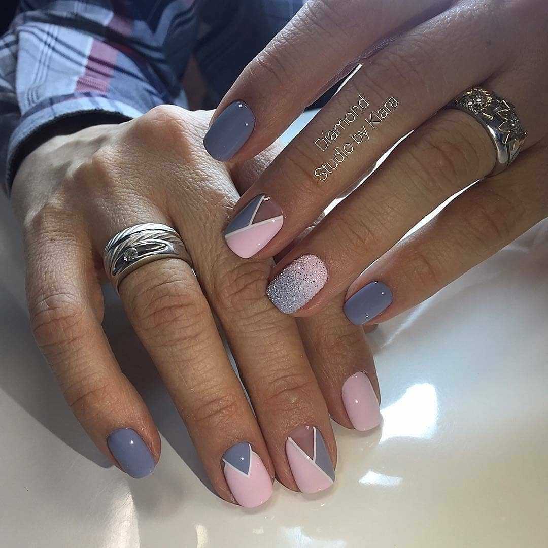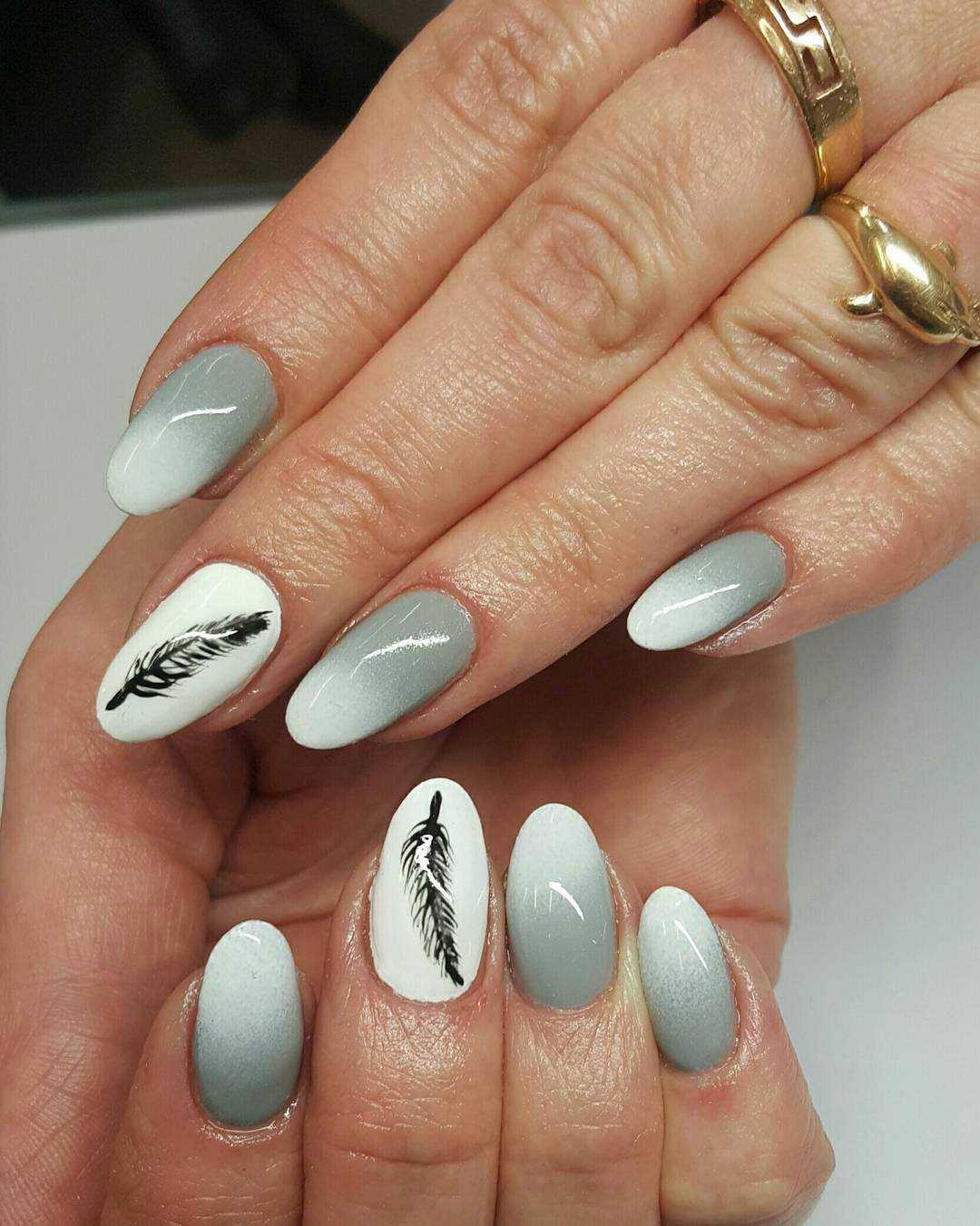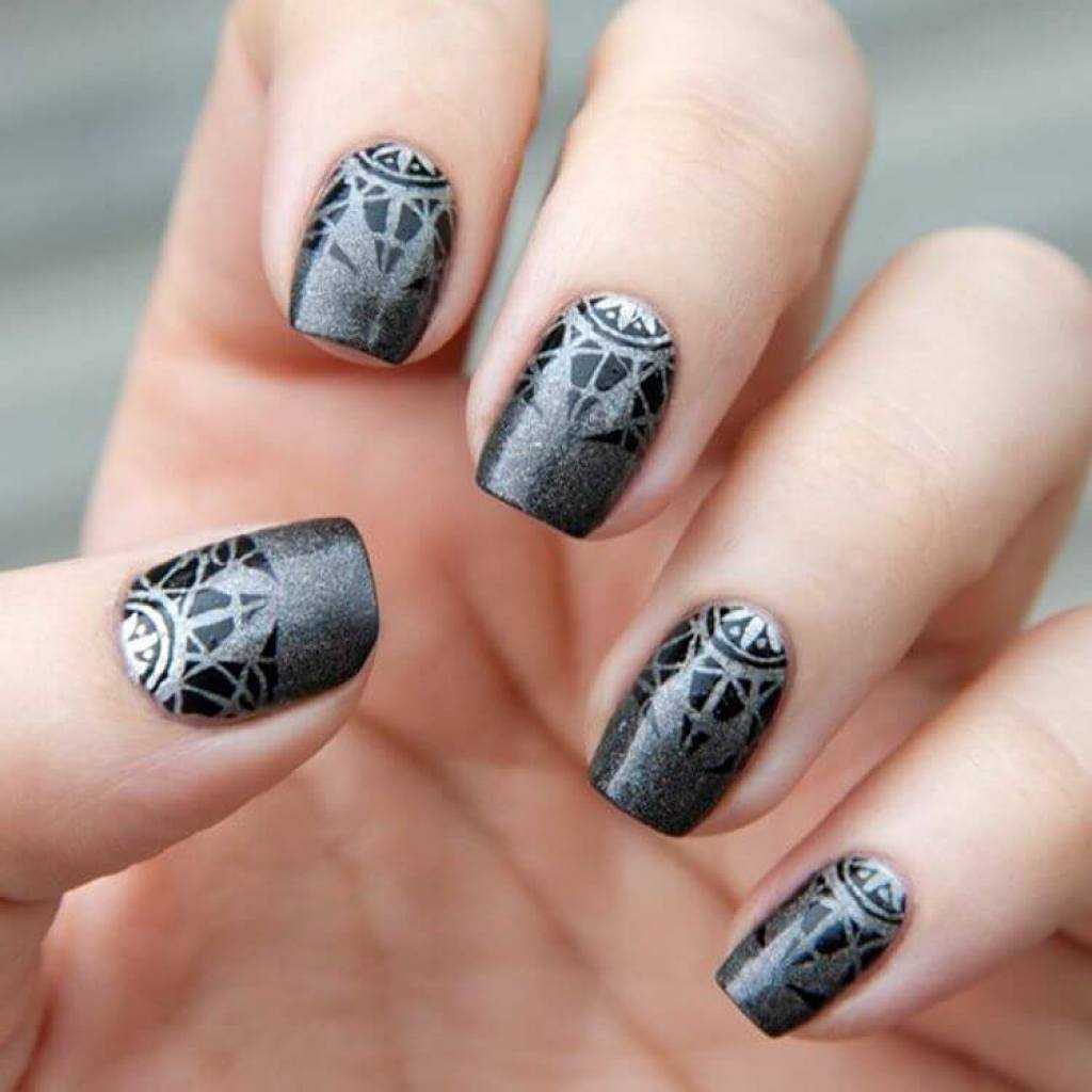 В рамках одного дизайна специалисты могут использовать сразу несколько оттенков серого, глянец, мат и серебристого цвета лак с перламутровым блеском либо глиттер. Как правило, оформляется подобный маникюр в виде полос.