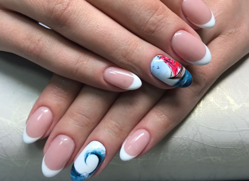 В топе модных тенденций французский маникюр с рисунком. Здесь несколько ногтей дополнительно украшаются рисунком. Выбор принта зависит от вашей фантазии, но все еще популярны растительные, абстрактные и цветочные мотивы.