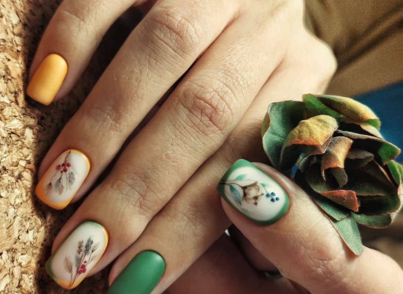 - для того, чтобы добавить свежести и яркости в маникюр, используют зелёные и желтые тона;