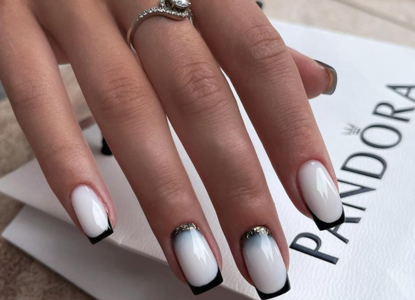 - отличным вариантом будет поэкспериментировать с цветами, и вместо привычного бежевого сделать ногтевую пластину белой или чёрной, при этом улыбка французского маникюра должна быть контрастной, по отношению к пластине;
