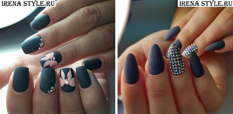 Обычный графитовый маникюр придаст больше моды и роскоши матовому топу. Обязательно рекомендуем попробовать! С ним привычный маникюр выступает абсолютно под другому. Пуанты или заостренные ногти рекомендуется делать матовыми чтобы смягчить углы.