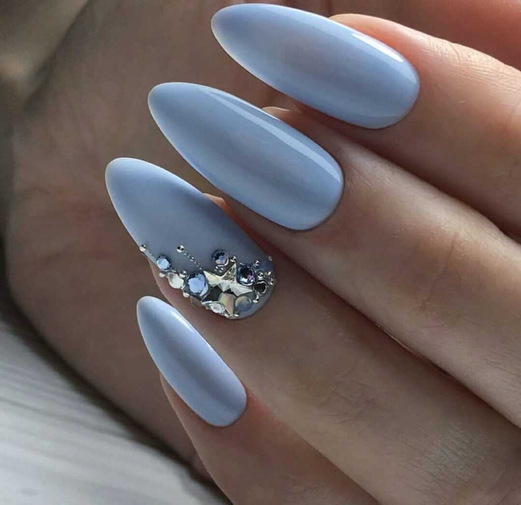 Стразиками также можно украсить и однотонный синий маникюр. Для повседневного маникюра большое количество декоративных элементов не подойдет. Но если вы на голубые ногти на безымянных пальцах наклеите по одной серебряной стразе, но маникюр будет выглядеть совершенно по-другому. Даже небольшие серебристые кристаллики станут настоящей изюминкой самого простого маникюра.