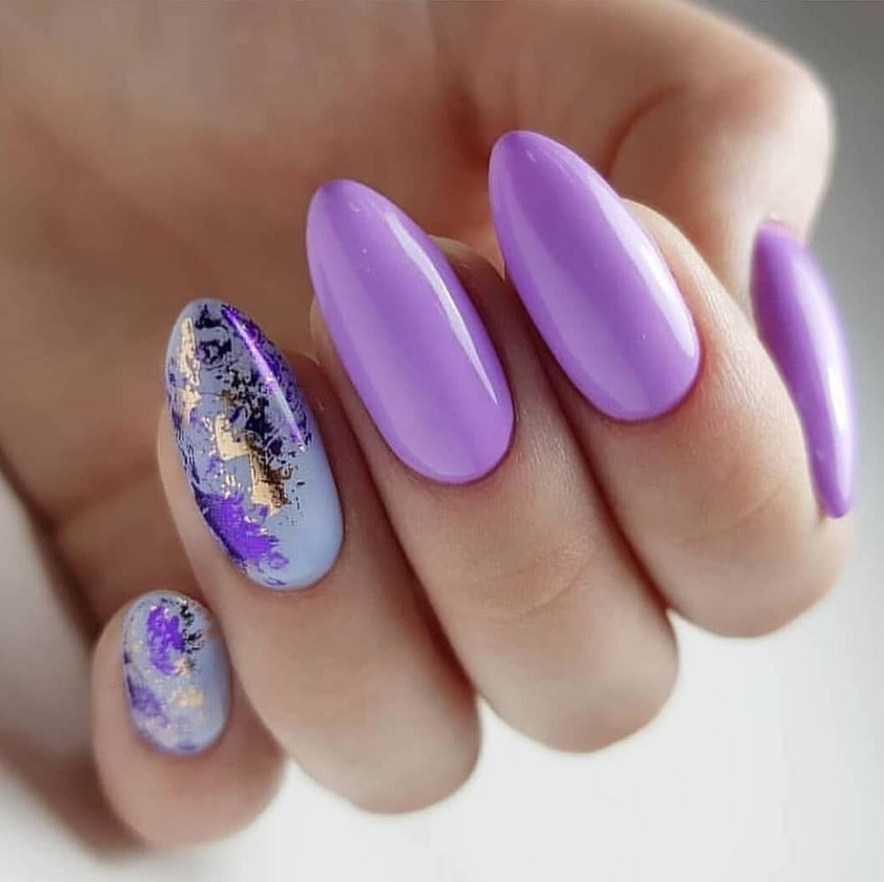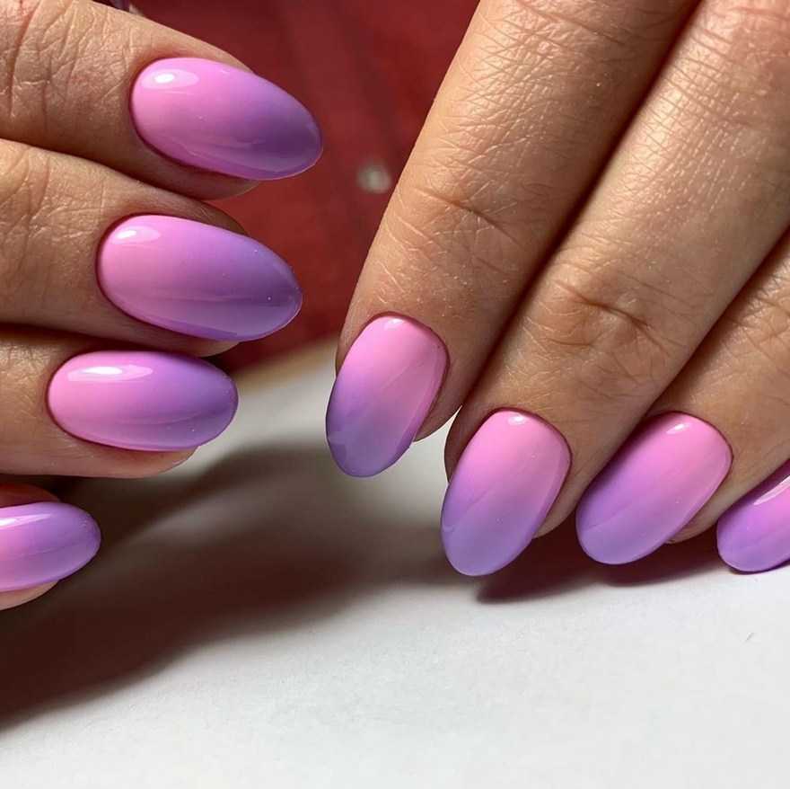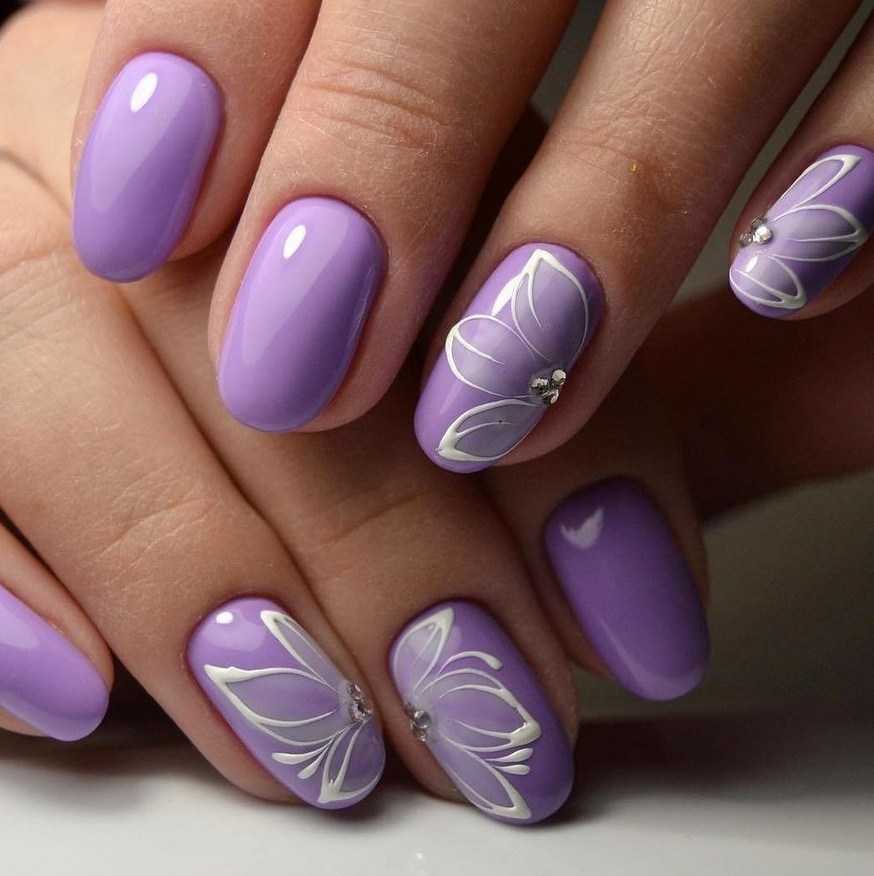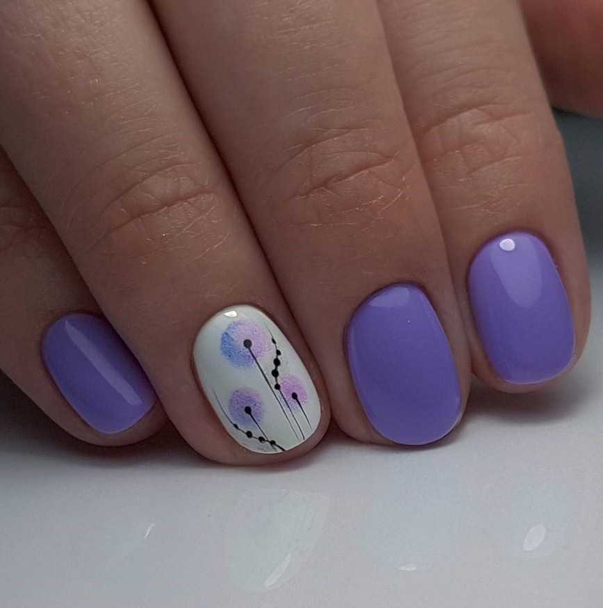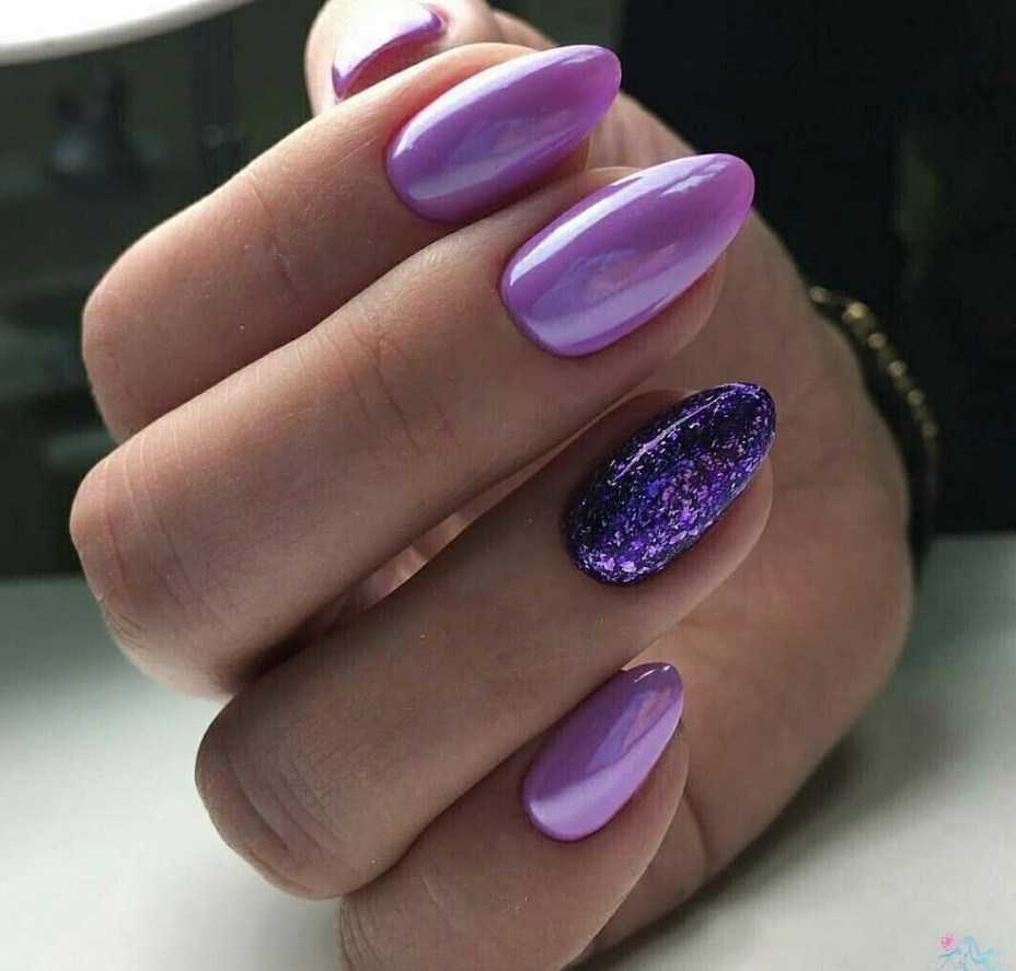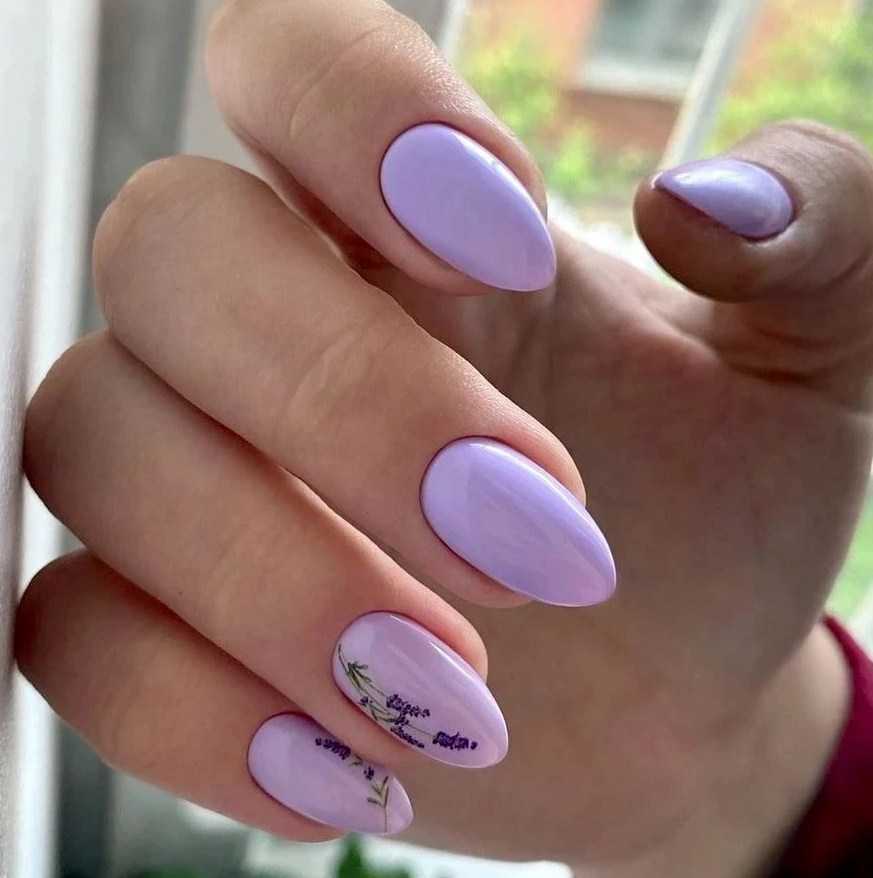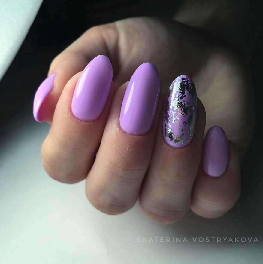 Для коротких ноготков овальной формы хорошо подойдёт однотонный дизайн. Не возбраняется его дополнение цветочками, минималистичными рисунками. На длинных ногтях лучше всего смотрится градиент в оттенках сирени.