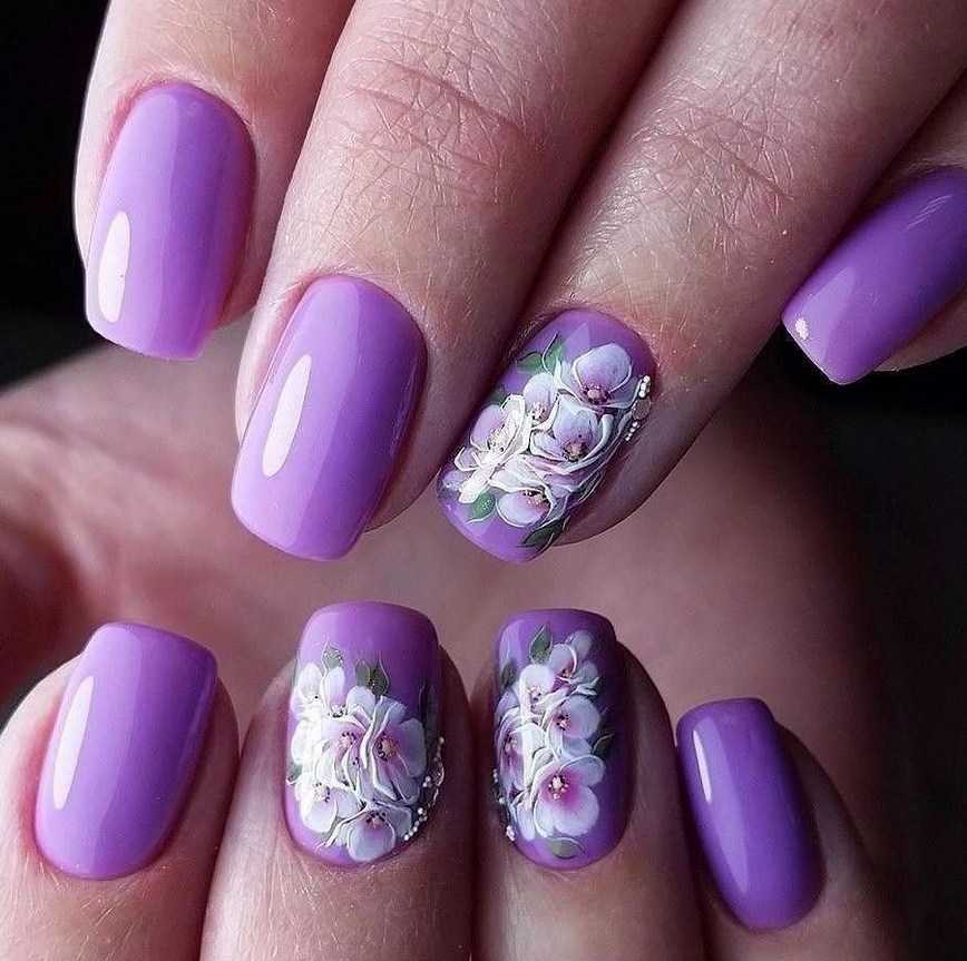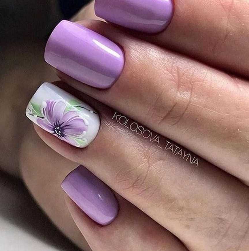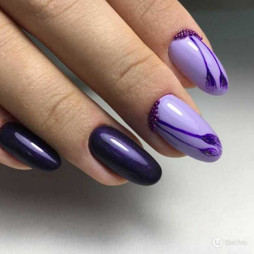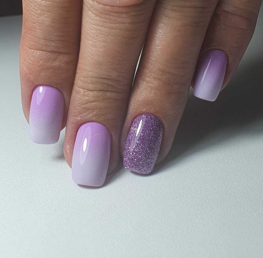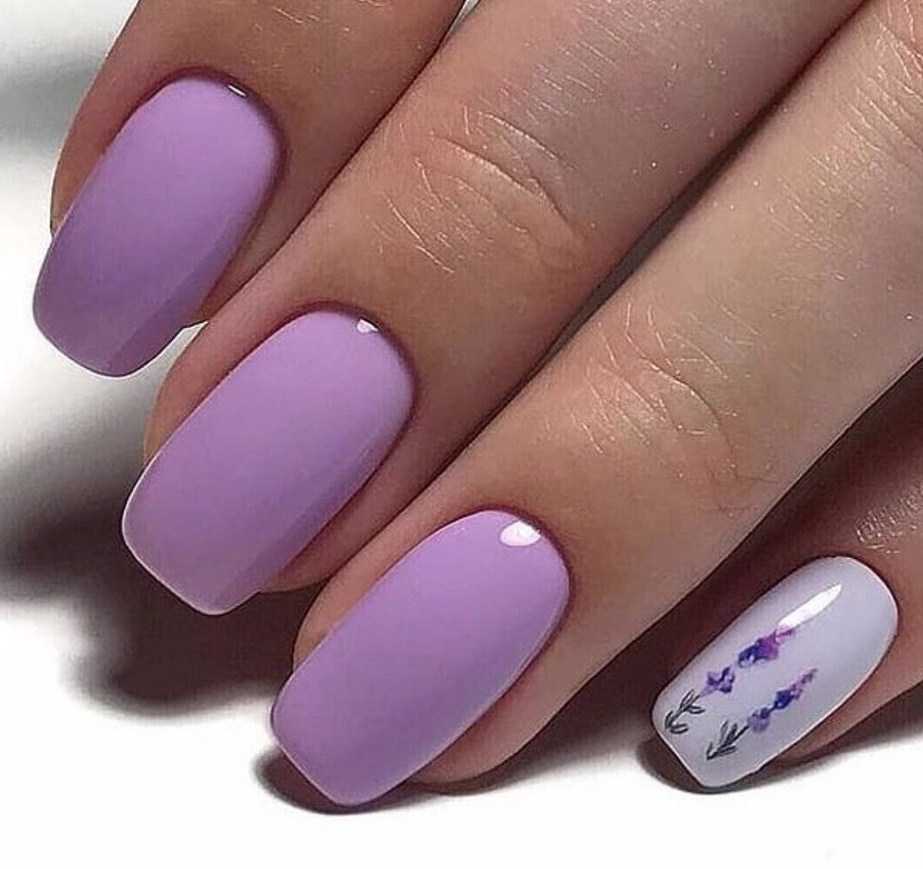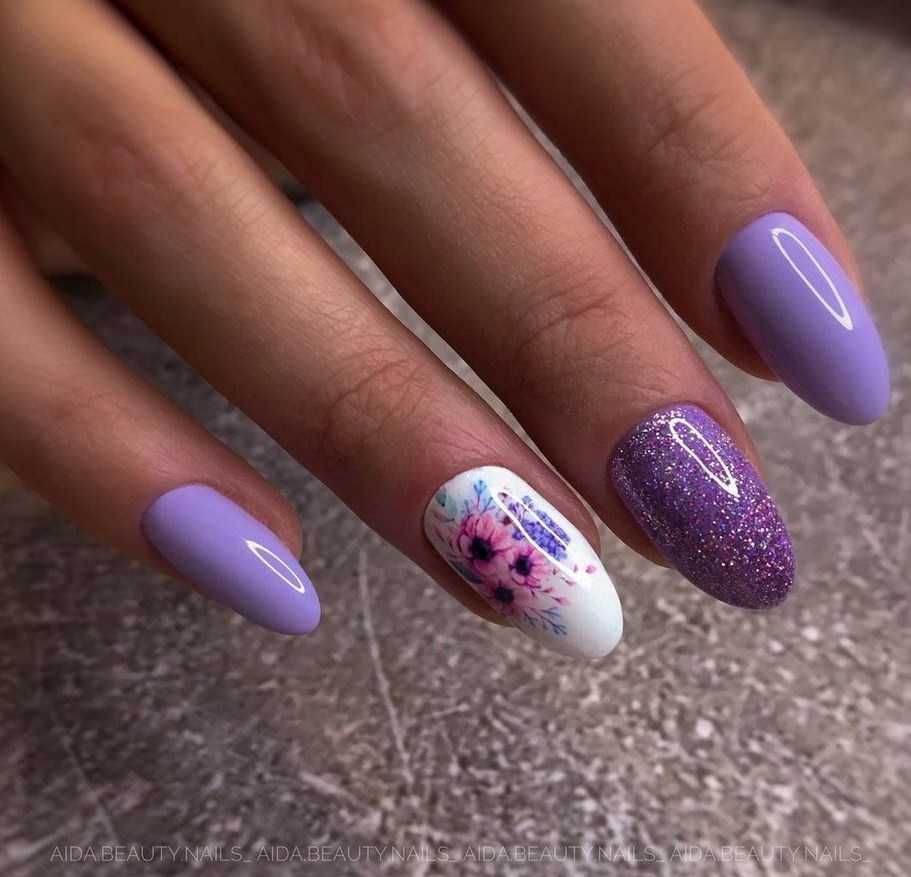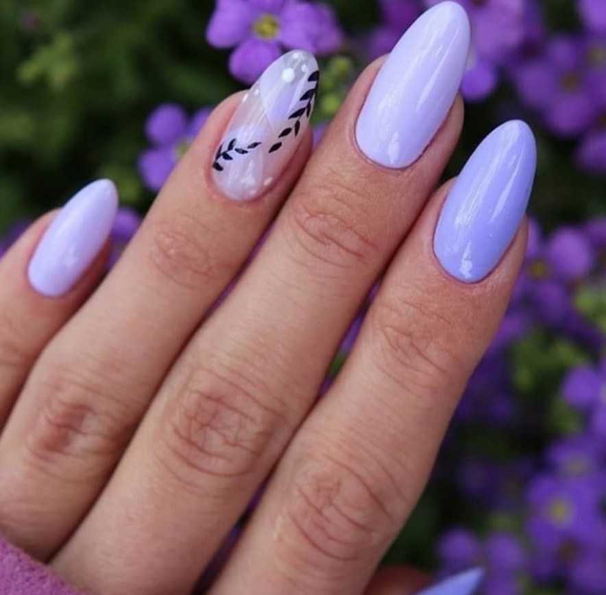 Для коротких ноготков овальной формы хорошо подойдёт однотонный дизайн. Не возбраняется его дополнение цветочками, минималистичными рисунками. На длинных ногтях лучше всего смотрится градиент в оттенках сирени.
