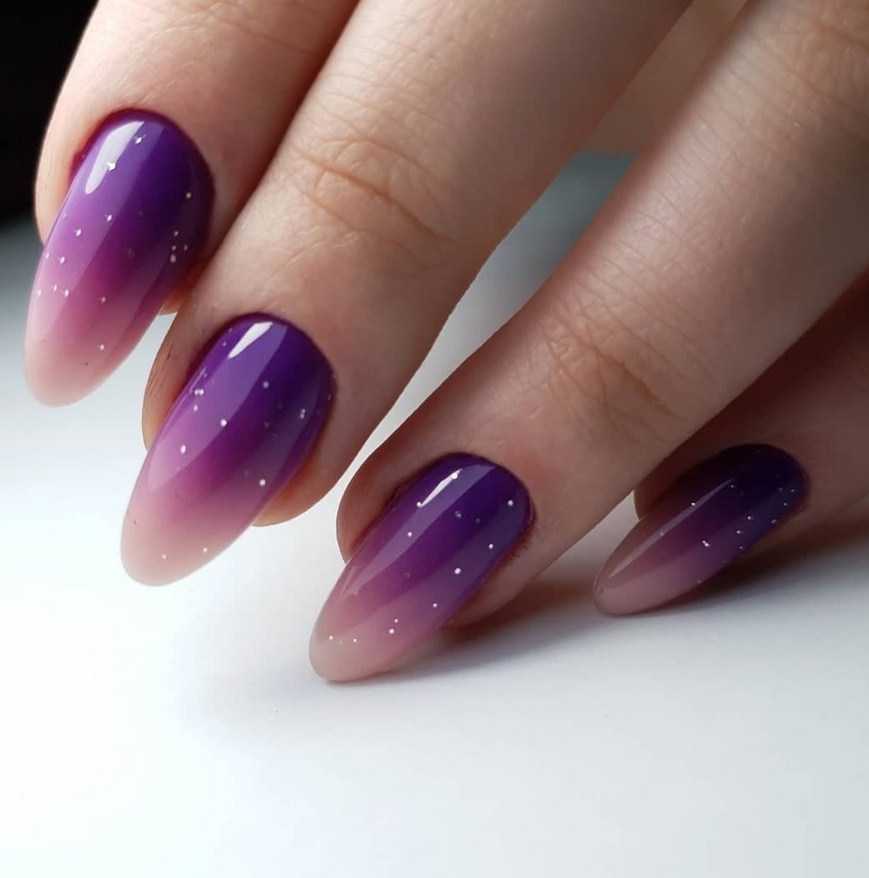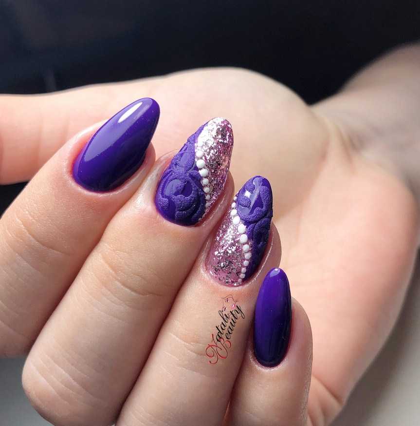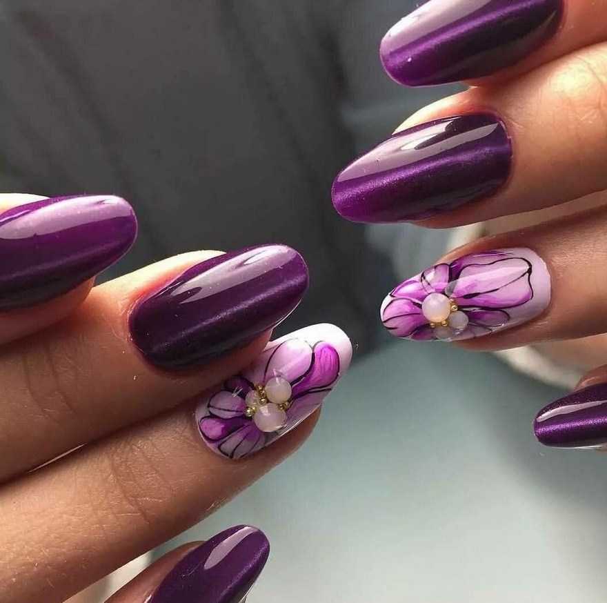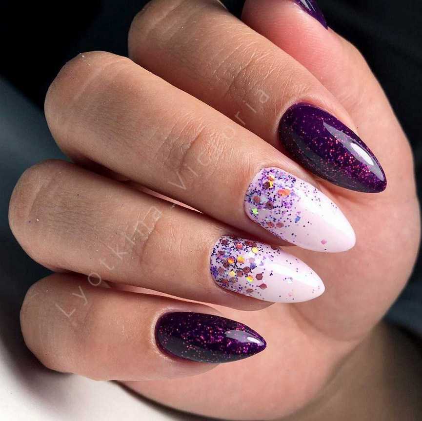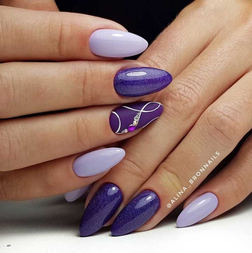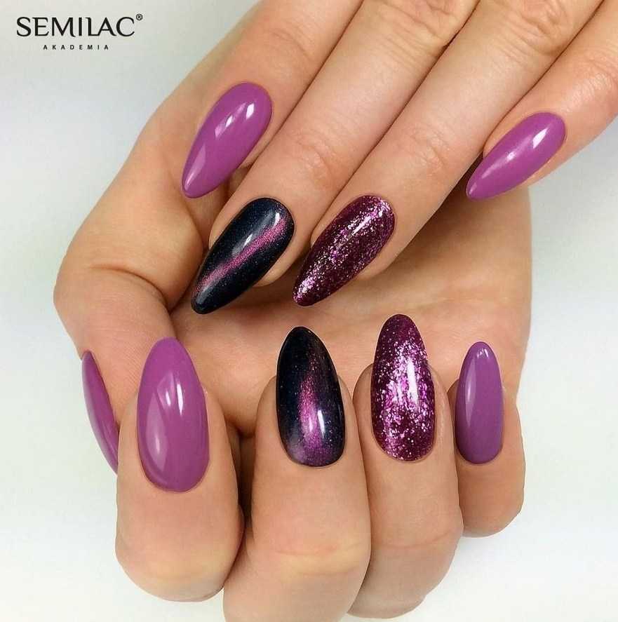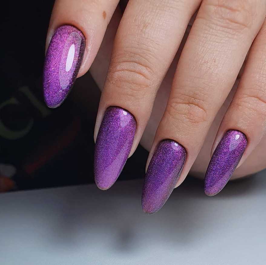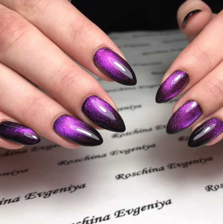 Форма миндаль – неизменная классика маникюра. Она отлично сочетается с любым оттенком из фиолетовой палитры – от пастельного до почти чёрного. Особенно эффектные варианты нейл-арта – кошачий глаз, омбре, френч.
