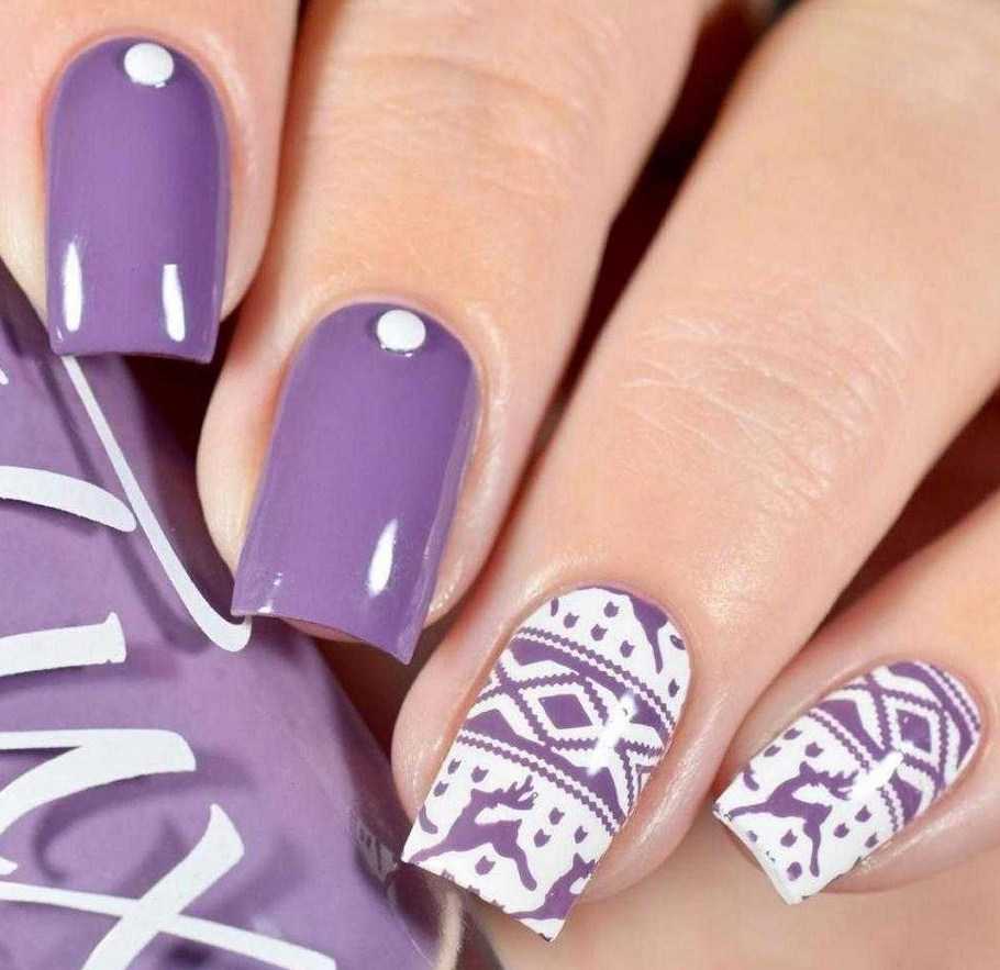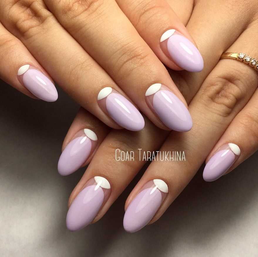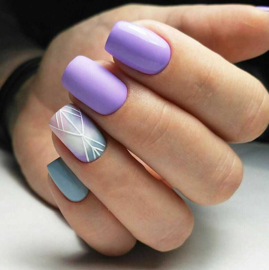Белый сочетается не абсолютно со всеми тонами сиреневой гаммы. В этот тандем лучше выбирать светлые матовые оттенки фиолетового. Сочетание с белым подойдет для градиента, френча, нежных витиеватых рисунков, геометрии и негативного пространства.