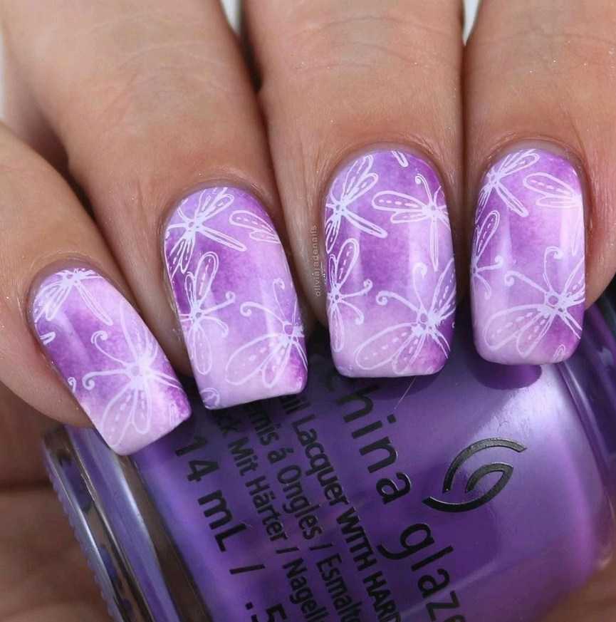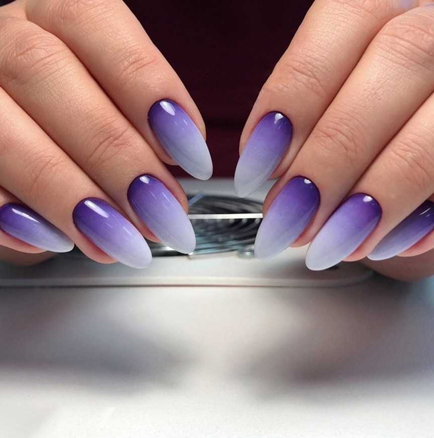 Эффектно смотрится омбре в фиолетово-белой гамме. На ногтях возникает своеобразная дымка. Переход оттенков может быть от самого темного фиолетового до белого или с использованием только светлых, пастельных тонов фиолетового.