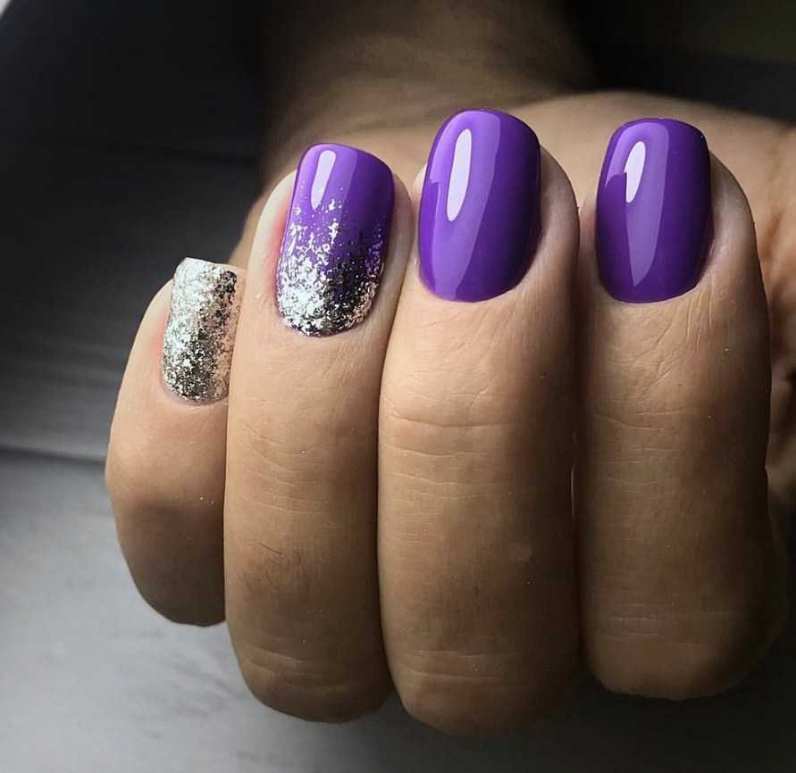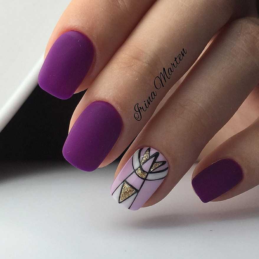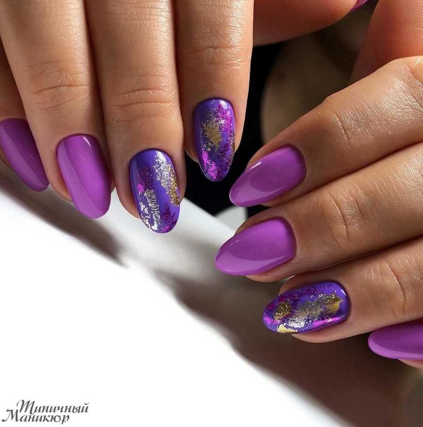 Не стоит отказываться от золотого декора. Жидкий драгоценный металл всегда выгодно смотрится на ноготках. Стоит помнить, что золотой больше подходит к темным вкусным оттенкам фиолетового: сливовому, лиловому, виноградному, пурпурному.