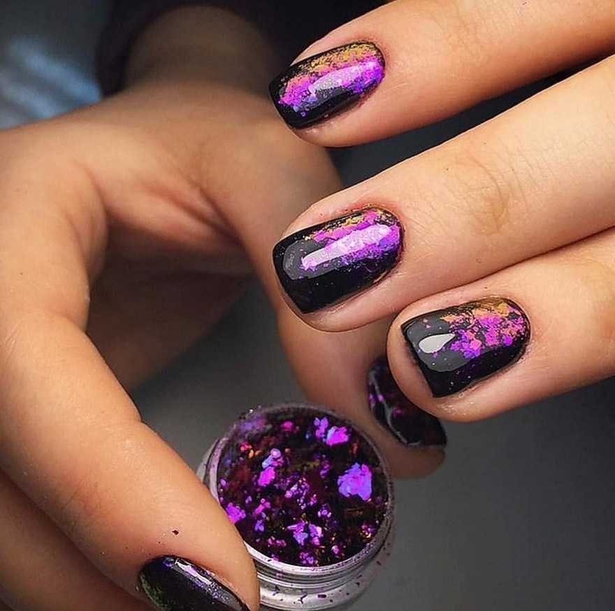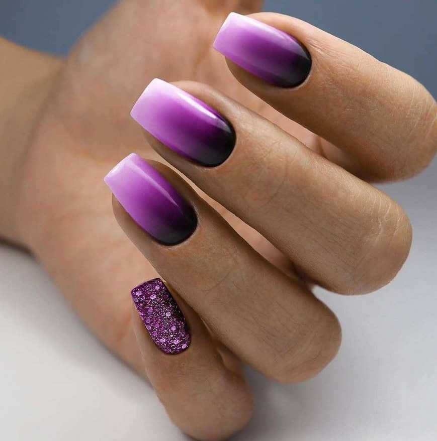 Отличный вариант — черно-сиреневый градиент, украшение сиреневой базы хлопьями юкки черного цвета или блестками.