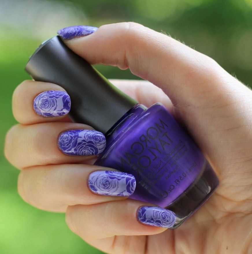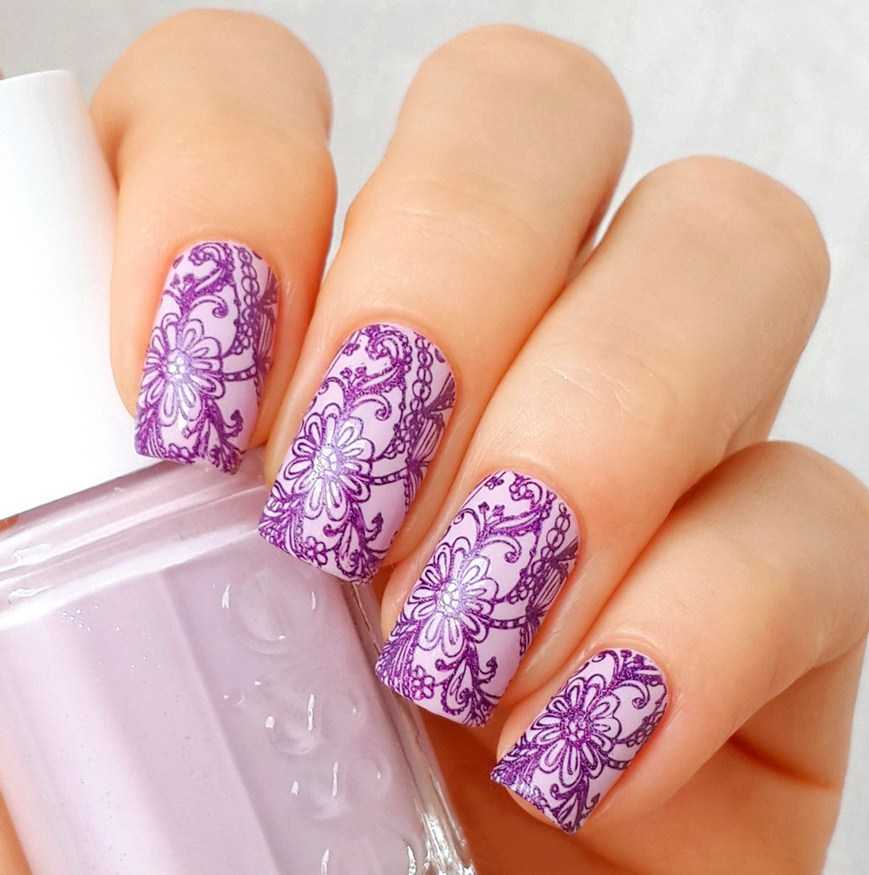 Для быстрого украшения ноготков широко используется техника стемпинга. Для фона цвета сирени популярны изображения цветов, животных принтов, надписей. Слайдеры также позволяют создать ненавязчивый нейл-арт без лишних забот и владения ручной росписью.