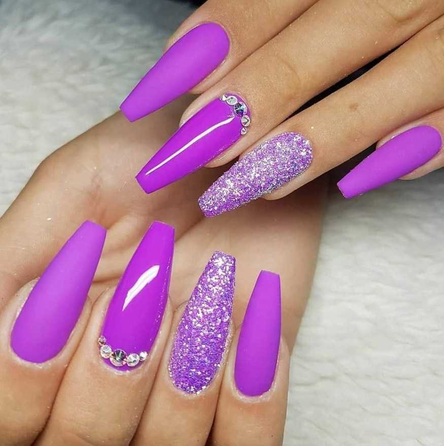 Яркий сиреневый обычно используют смелые барышни. Однако ногти должны быть безупречными. Любая погрешность сразу же оказывается заметной.