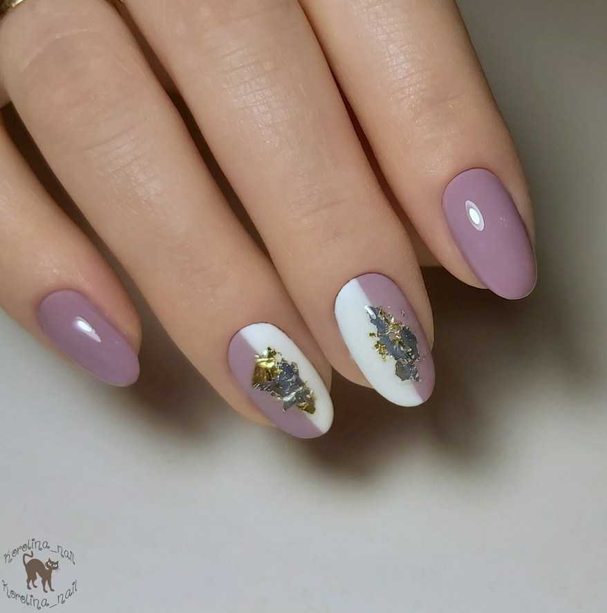 Кусочки металлического декора помогут украсить простой однотонный маникюр, если хочется сделать его более разнообразным. Фольга даёт шикарные сочетания с сиренью, причём как в серебристом, так и в золотом цвете.