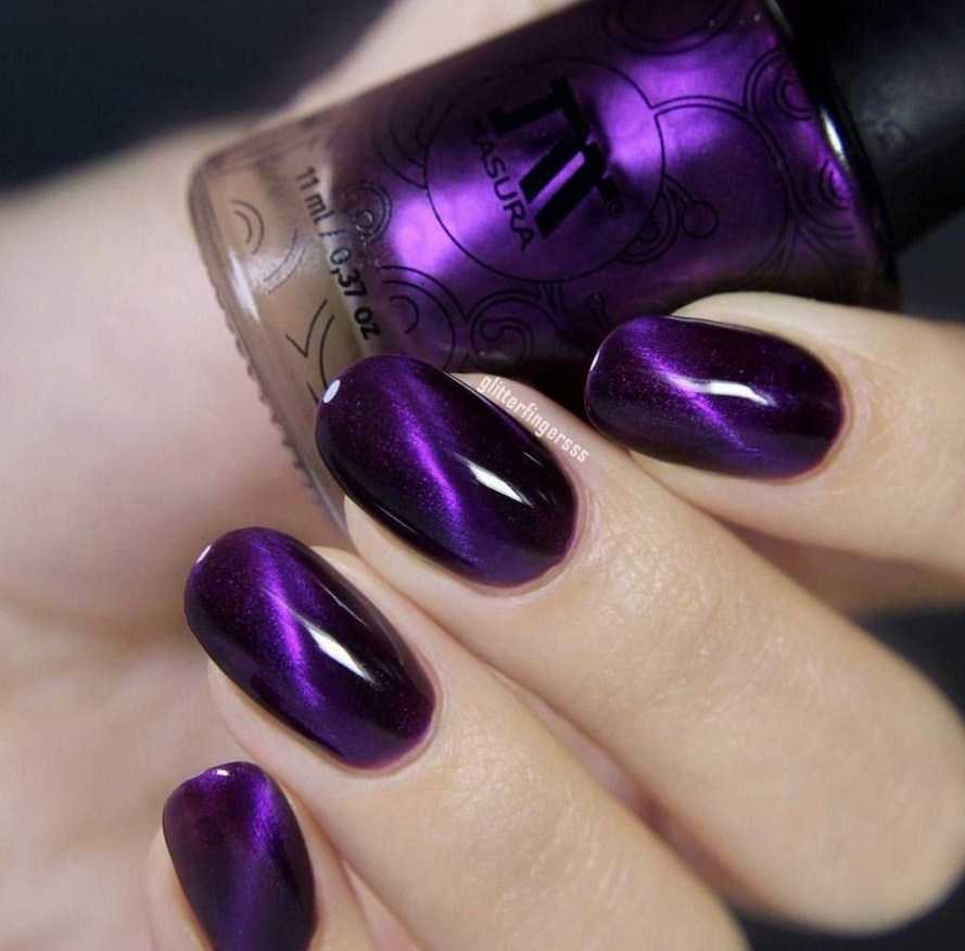 Такой дизайн выполняется с помощью особого лака с металлическими частицами. После поднесения магнита они красиво распределяются по поверхности и формируют необычный рисунок. Обычно для получения таинственного нейл-арта используют магнитный лак тёмно-сиреневого оттенка.