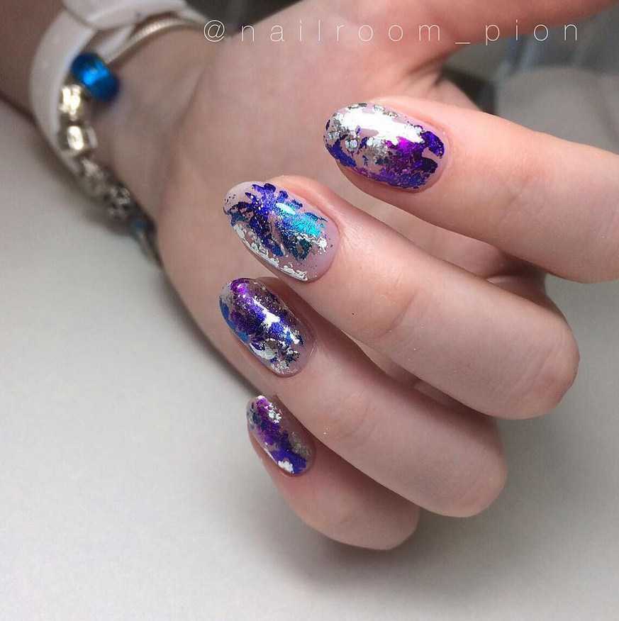 Синий — цвет, который поучаствовал в образовании оттенков фиолетовой гаммы. А значит он отлично подойдет для сочетания с сиреневым. Здесь отлично смотрится геометрический дизайн, градиент — вертикальный и горизонтальный, кошачий глаз, сочетание с синима хлопьями юкки на сиреневом фоне, втирка.