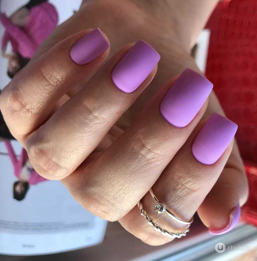 Такая форма считается одной из самых стильных и красивых, хоть и требует тщательного ухода. На квадратные ногти больше подходят тёмные оттенки сирени, так как светлые визуально расширяют область края.