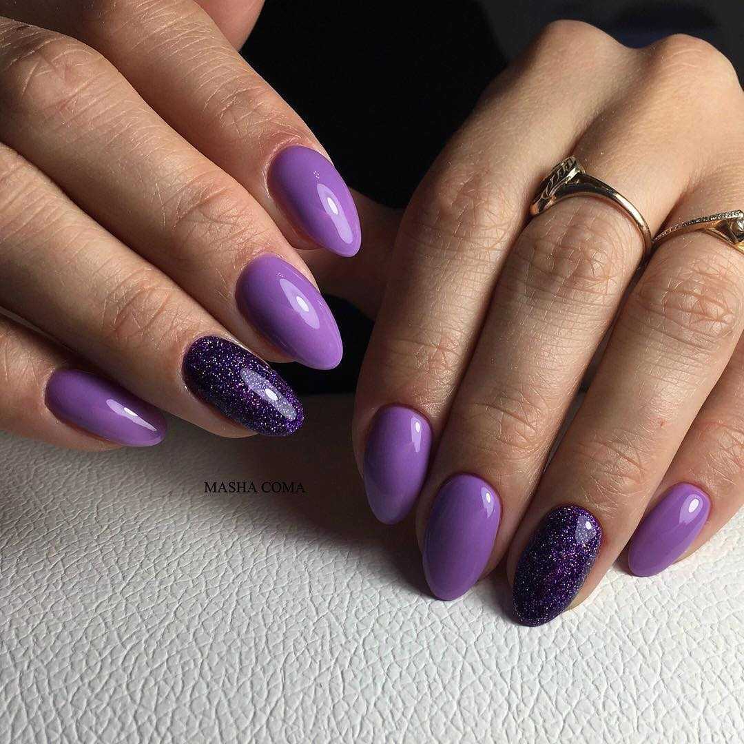 Если вы хотите, чтобы однотонный маникюр смотрелся интереснее, то используйте несколько оттенков фиолетового. Достаточно выбрать два схожих полутона фиолетового, чтобы однотонный маникюр выглядел динамичнее и эффектнее. Нейл-мастера рекомендуют использовать для однотонного покрытия глянцевые гель-лаки. На матовой поверхности фиолетовый цвет будет выглядеть тускло, нуждаться в блестящем декоре стразами, бульонками, глиттером.