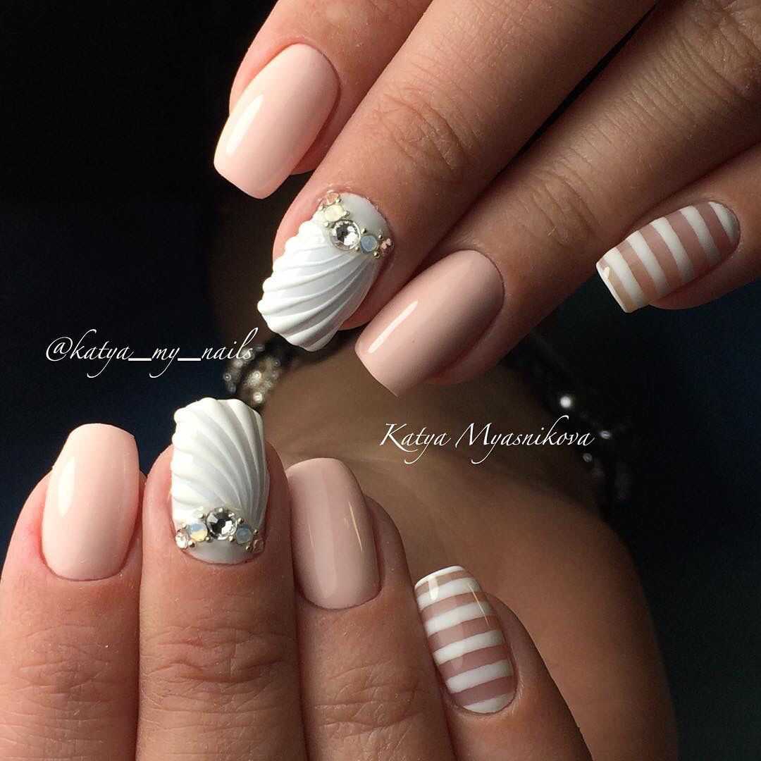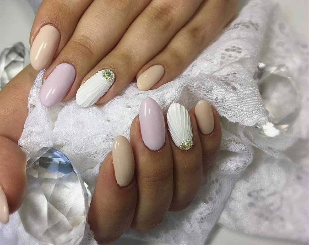 “Ракушка” выполняется с помощью гель-пасты или густого гель-лака. На фото вы можете увидеть несколько примеров этого оригинального и эффектного дизайна ногтей. “Ракушку” лучше выполнять на 1-2 пальцах руки, а остальные ноготки окрасить в однотонный белый, сиреневый или розовый цвет. Маникюр “ракушка” шикарно смотрится с декором стразами или бульонками. Также можно пофантазировать на морскую тематику и дополнить маникюр узором с чешуей.