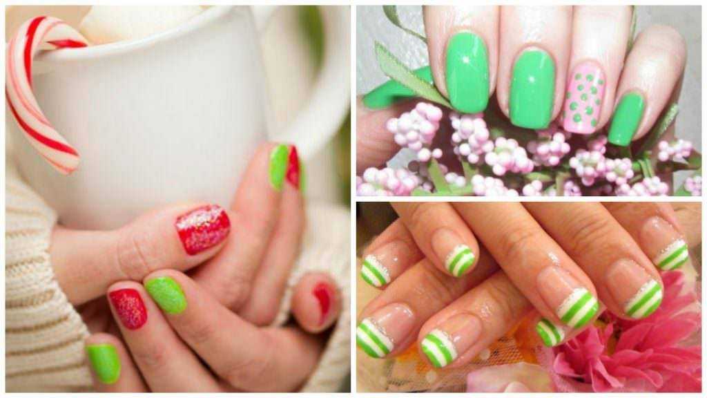 Стильно и не навязчиво смотрятся дизайны зеленого маникюра в комбинациях с желтыми, белыми и голубыми оттенками.