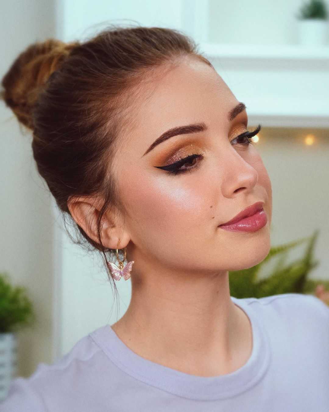 - Теплые натуральные оттенки, такие как беж, мокко, песочный, персиковый помогут сделать глаза выразительными.