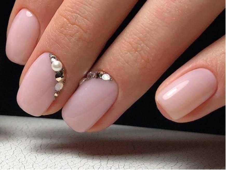 Чтобы разбавить скромный дизайн нюд, используйте стразы. Они сделают ваши ноготки шикарными.