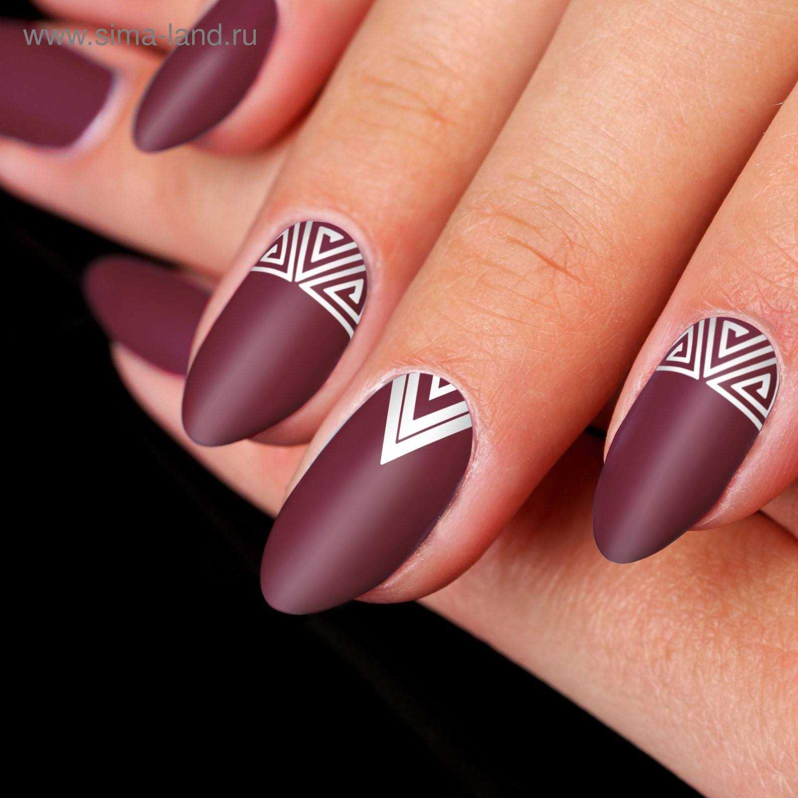 Иногда заостренная форма пластины с глянцевым лаком смотрится довольно хищно. Матовая текстура позволит немного приглушить ее и сделать маникюр более изысканным и стильным. На матовой поверхности отлично смотрятся надписи или тематические рисунки.
