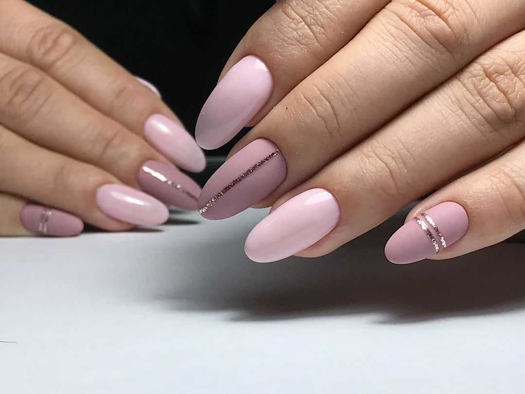 Интересно смотрится на ногтях с острым кончиком дизайн омбре. Специалисты рекомендуют выбирать гамму, при которой к кончику идет более темный фон. Так создается эффект концентрации цвета. Другой вариант — растяжка блестками. Начать ее вы можете с любого кончика пластины.
