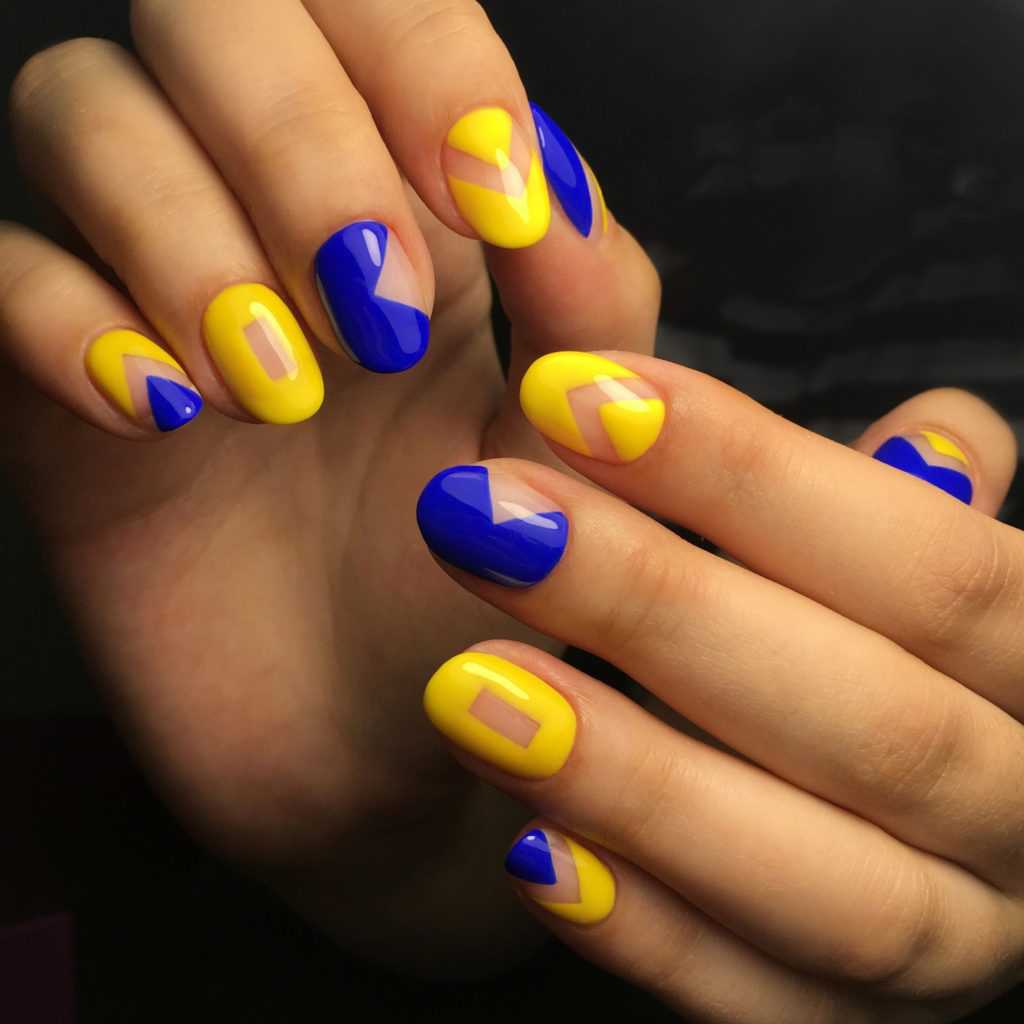 Желто-синий маникюр также часто применяется в виде геометрического узора, когда ногтевая пластина окрашивается пополам одним цветом, затем другим, или же другой цвет наносится на кончик ногтя треугольником.