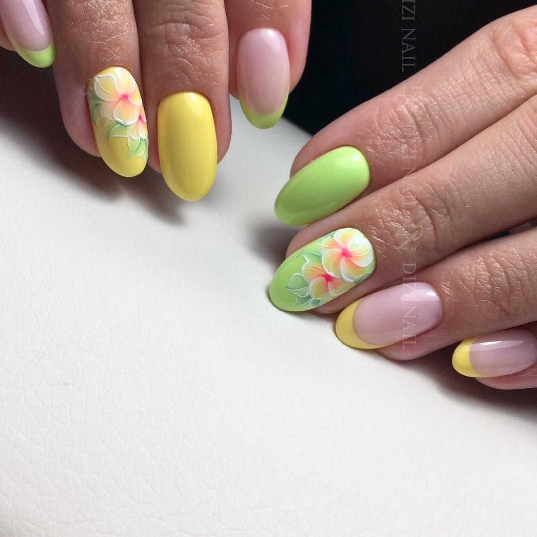 Растительные мотивы, такие как цветы, лепестки и зеленые листья, хорошо сочетаются с желтым французским.