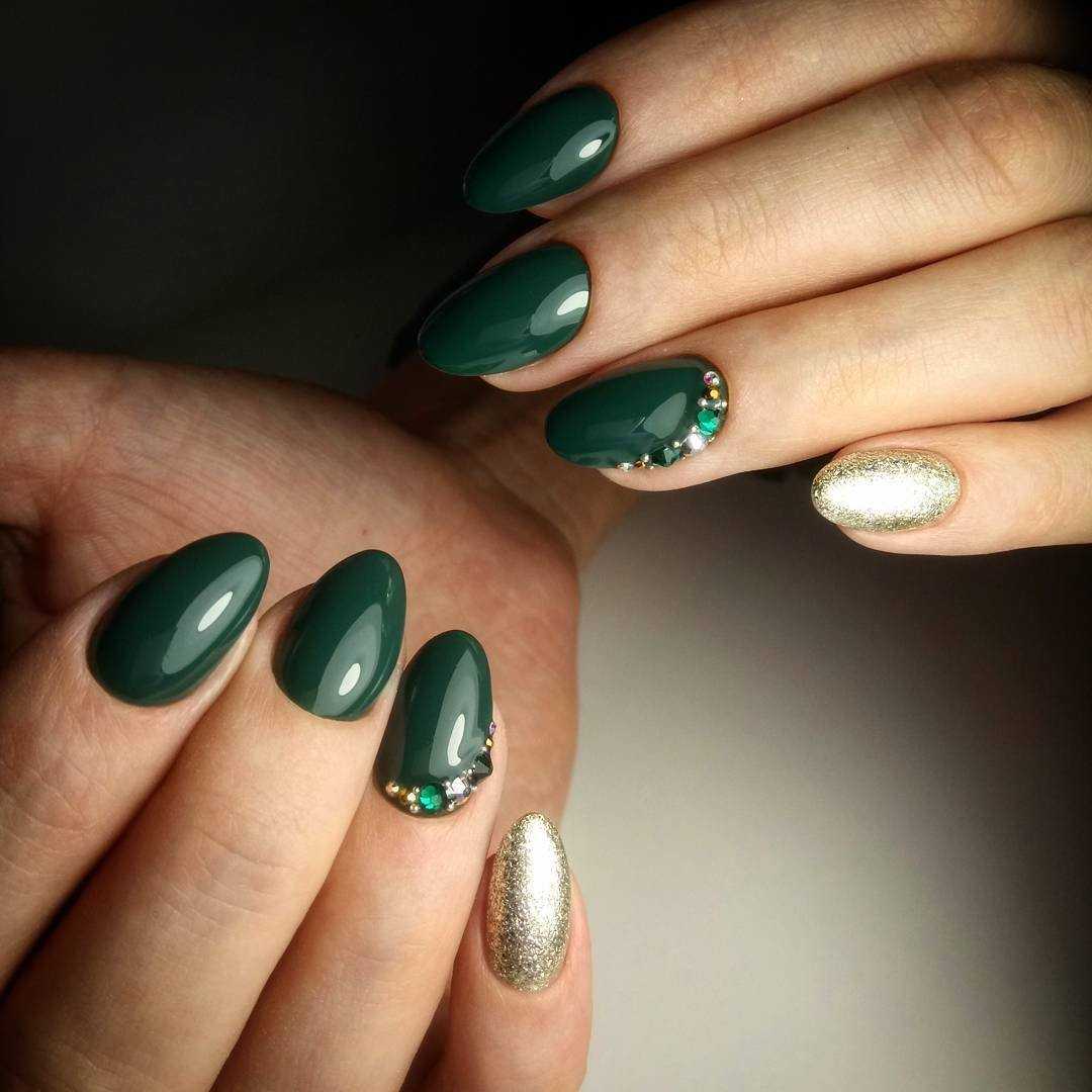 В свою очередь, темные оттенки зеленого лучше сочетаются с серым, черным, а также золотым или серебряным цветом. Такой маникюр идеально подходит для вечернего выхода и любого праздничного мероприятия. Его чаще всего дополнительно украшают различными деталями по своему вкусу. Это могут быть блестки, стразы, “битое стекло” и многое другое.