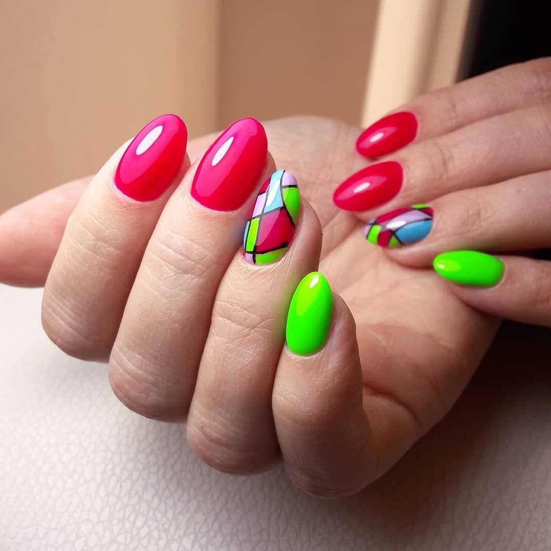 Добавить яркости салатовому маникюру можно с помощью неоновых оттенков желтого и насыщенного зеленого