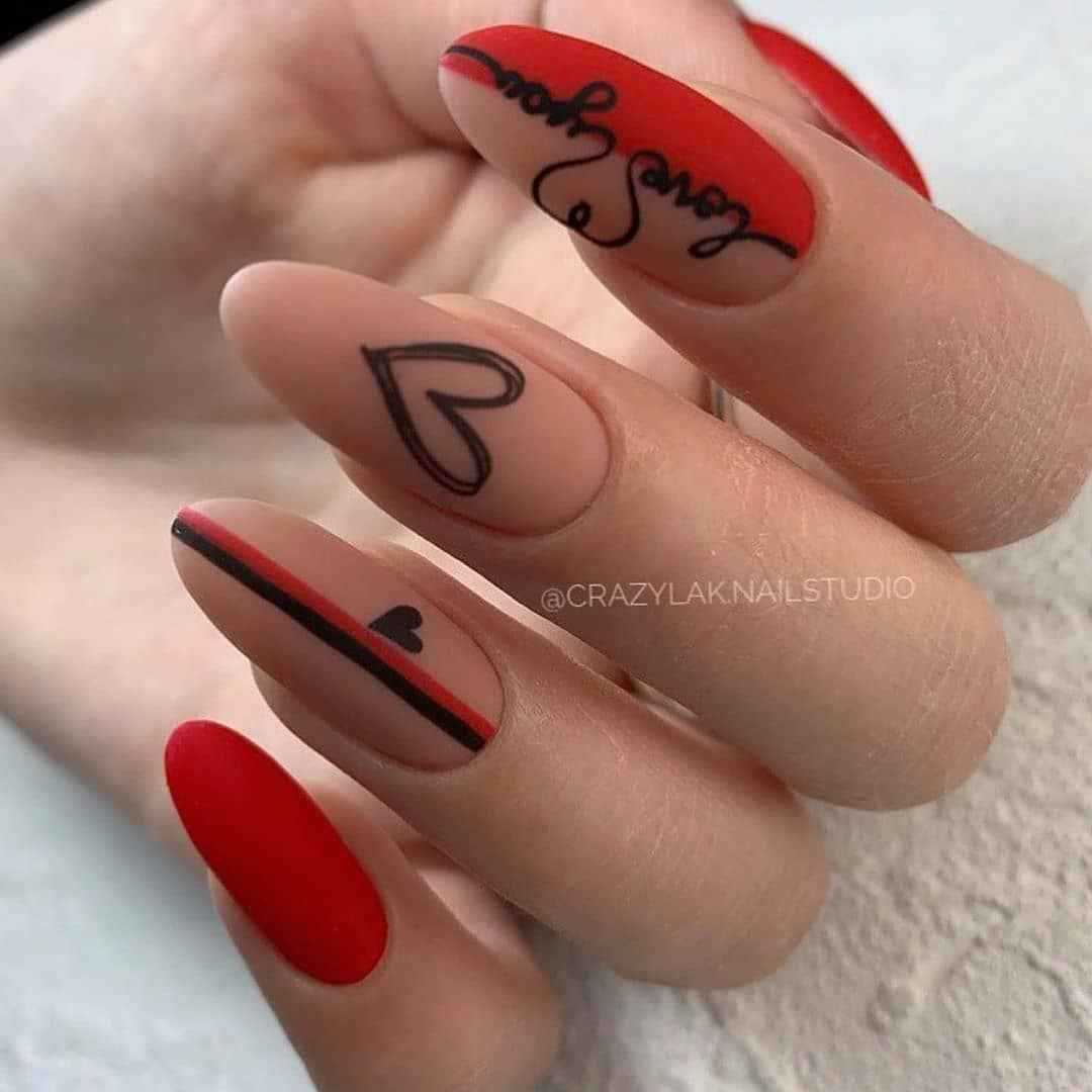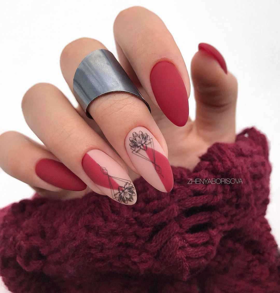 Красный матовый маникюр с дизайном