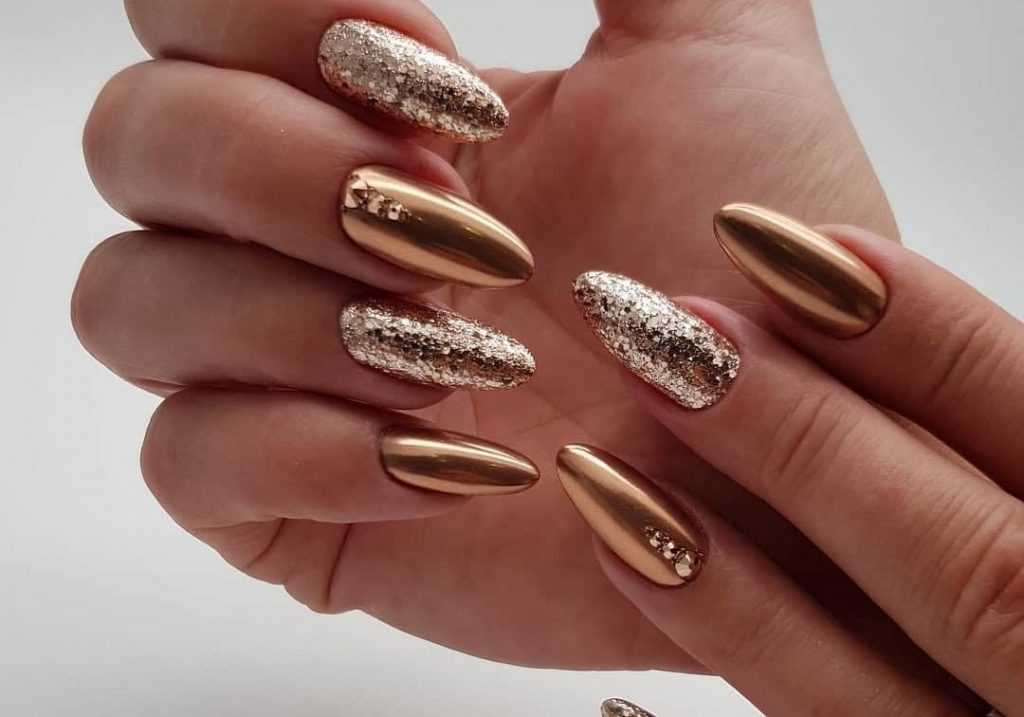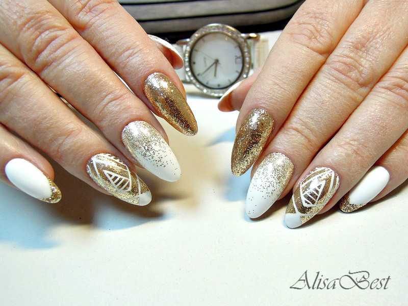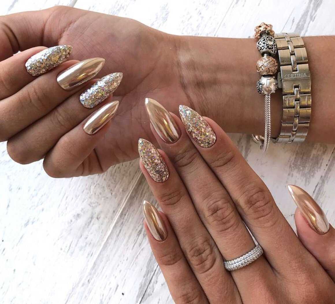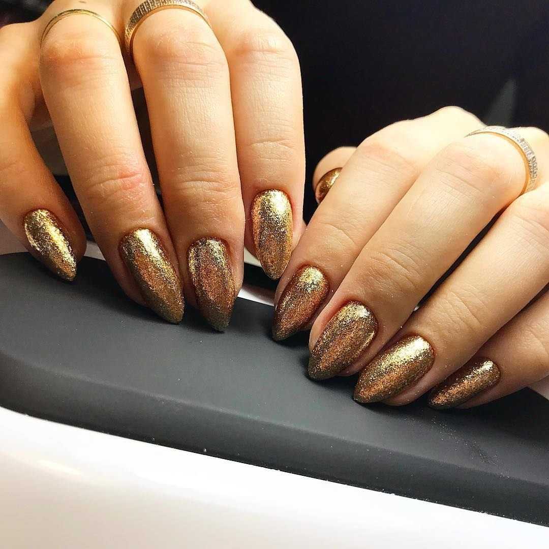 Когда выбор пал на золотистый маникюр во время подготовки к празднику – новогодней вечеринке, свадебной церемонии друзей, корпоративного торжества в офисе, можно проявить смелость в выборе дизайном. Ничто не ограничивает свободу дамы. Ей подвластны любые пожелания. Почерпнуть вдохновение при этом можно из следующих примеров: