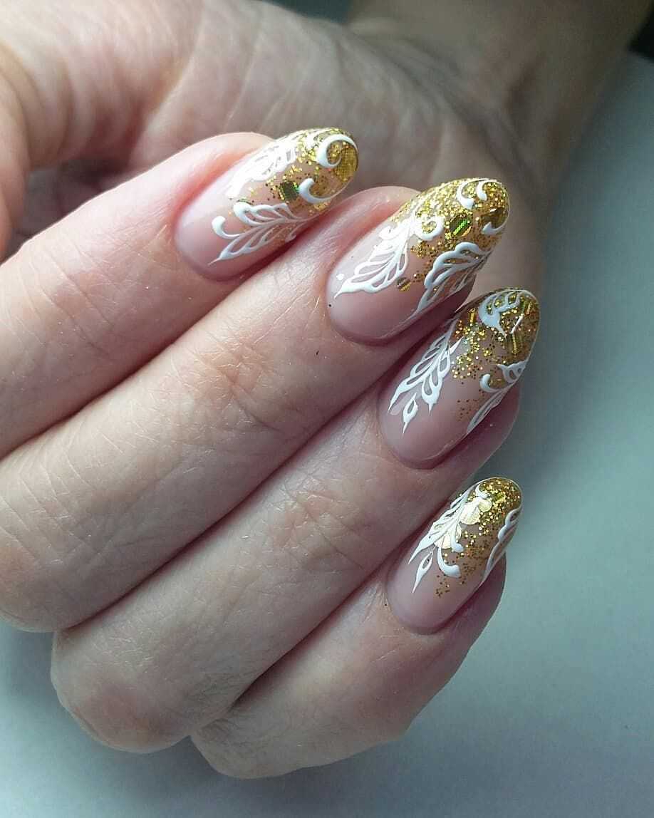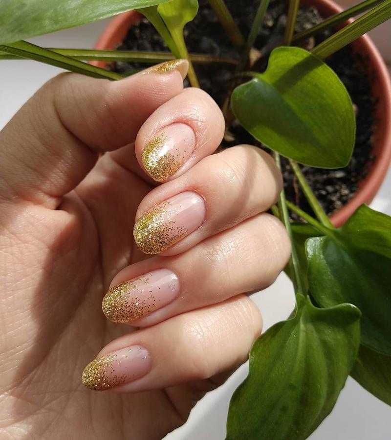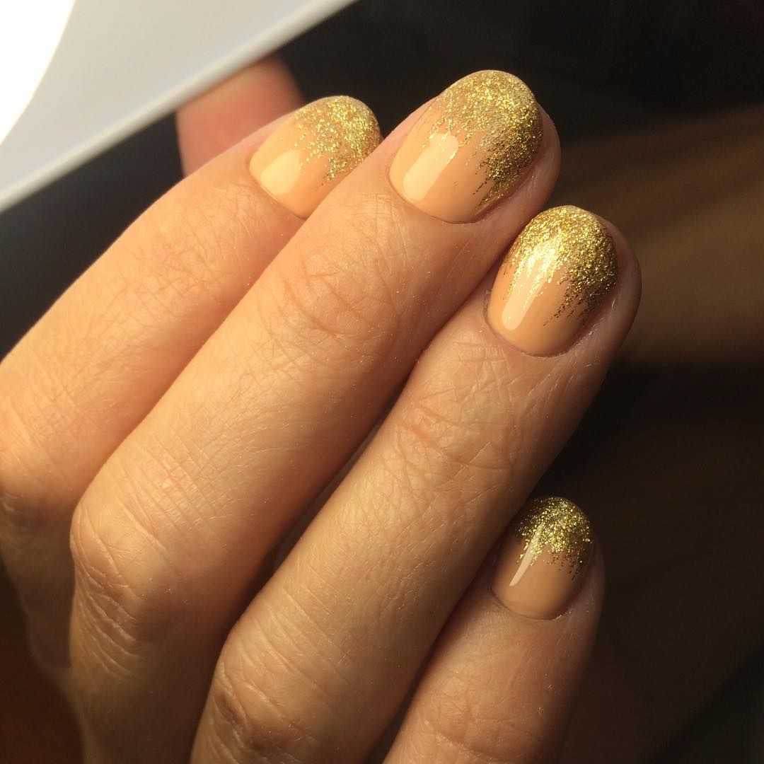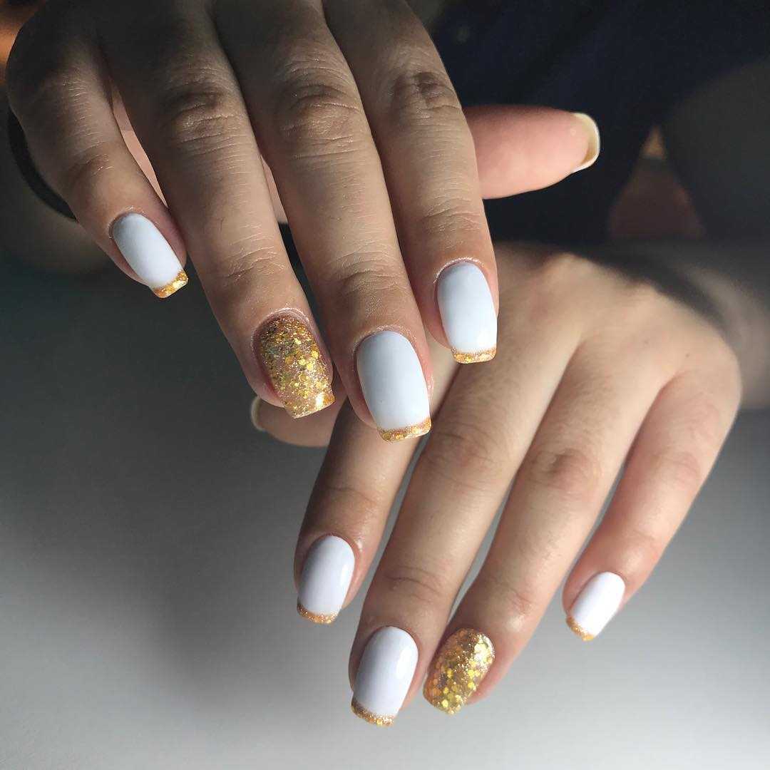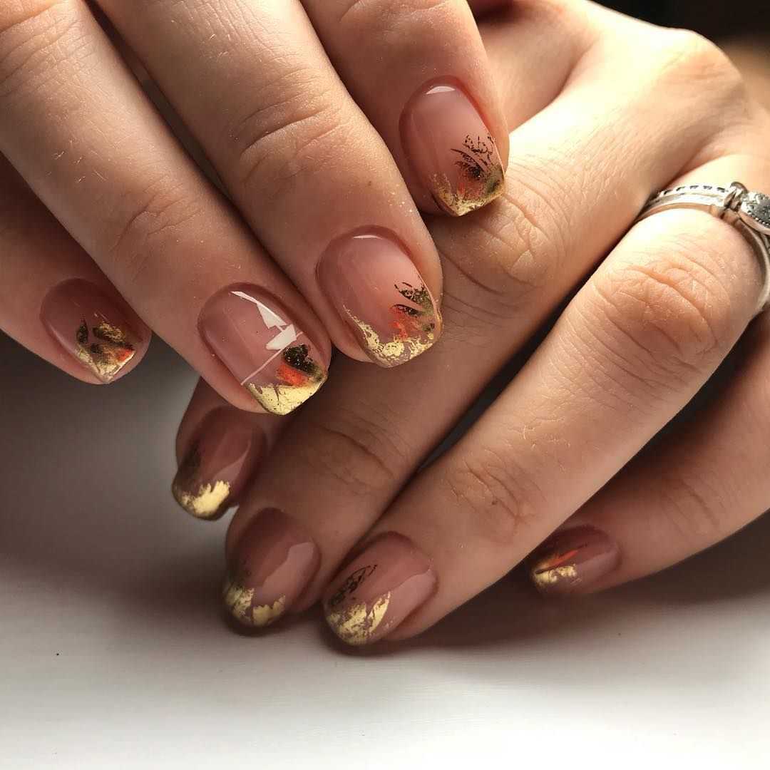 Ещё один удачный вариант такого дизайна — роскошное золото со сверкающими акцентами оранжевого цвета. Благодаря этим цветам молочный маникюр обретает свежесть и привлекательность.