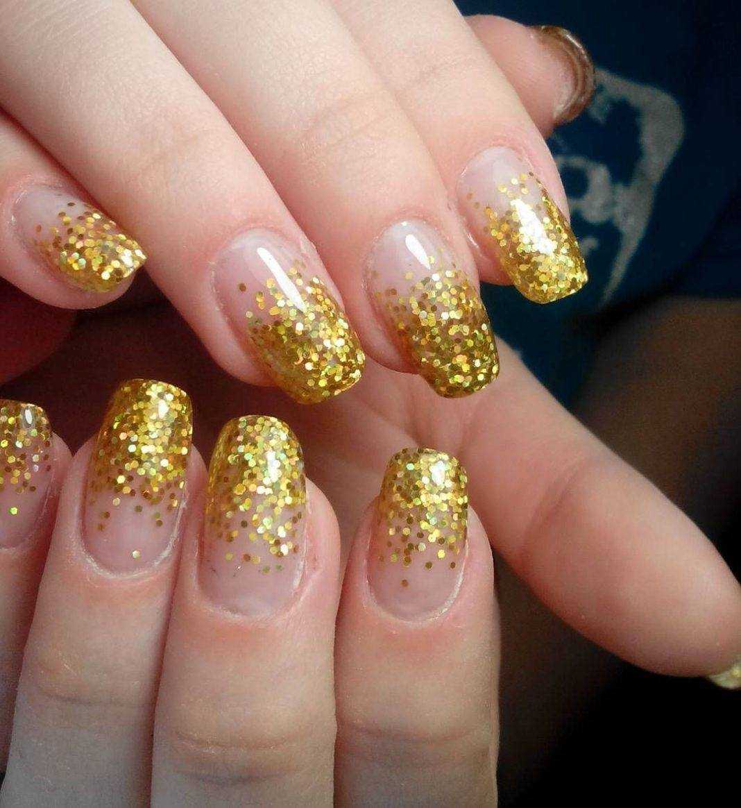 Необычайно смотрится сочетание черного фона и яркого переливающегося златом золотистого кончика на ноготке. Такой дизайн точно соберет массу комплиментов на торжестве. Чтобы сделать переход цветов мягким, мастера ногтевого искусства применяют градуированную технику. Результат ошеломляет.