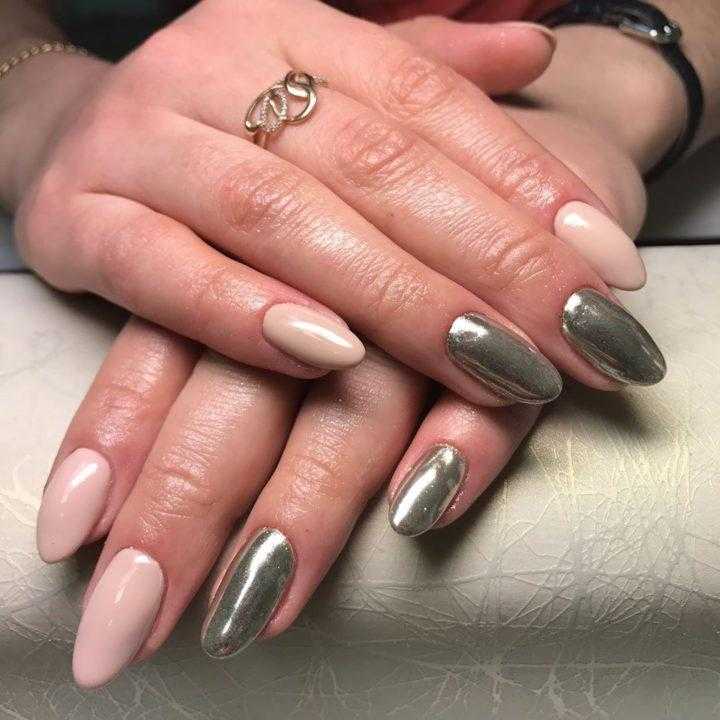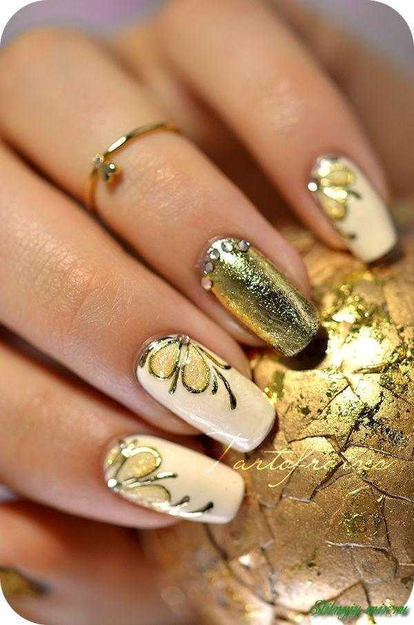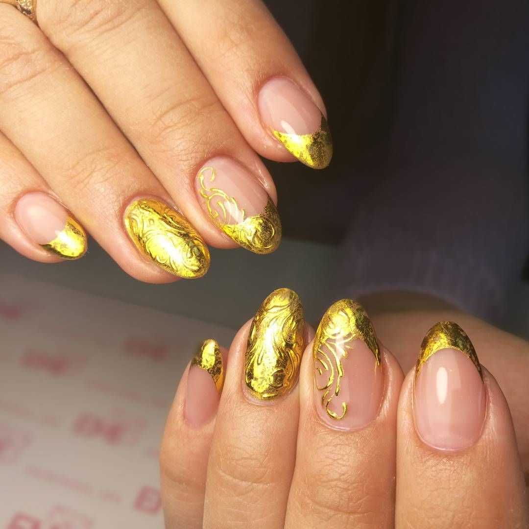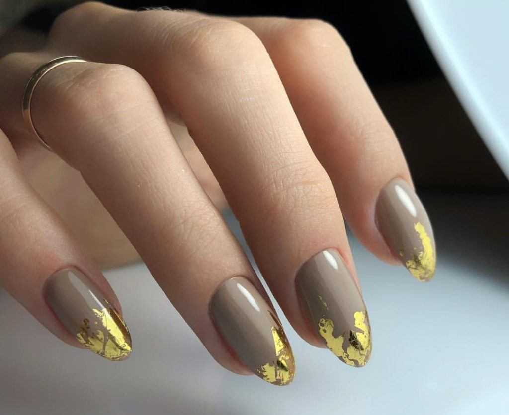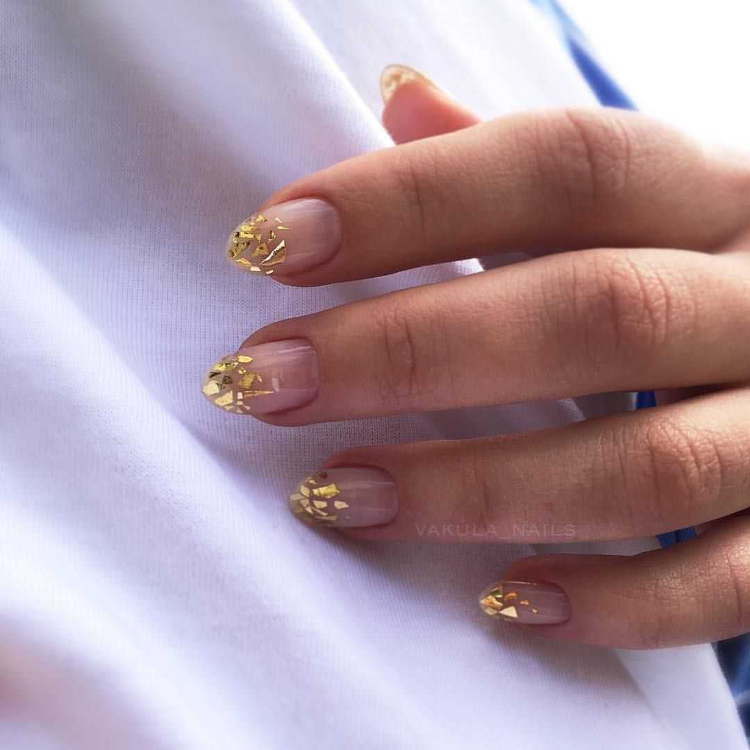 Нюд с фольгой. Нюд помогает сгладить яркость фольги и уравновешивает дизайн. В таком случае фольга наносится не на весь ноготь, а только сверху или снизу. Получается нежная и красивая абстракция. Отлично сочетается сусальная фольга (золотистая, серебристая) с бежевым оттенком. Можно попробовать и дополнительные элементы дизайна в виде страз.